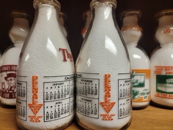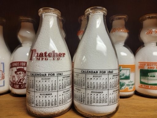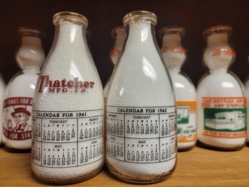 Finding 1941 & 1942 Thatcher round calendar milk bottles offered for sale can be difficult to do. Most of them were professionally painted inside to be used as display bottles for customers. These two bottles were never sent away for inside painting for some reason. This 1942 example has black months just like the 1941 example. The 1942 examples that are seen painted inside has blue month calendars. Any milk collectors who could share thoughts or information on these bottles would be appreciated. They are quite rare & even more difficult than the inside painted ones.