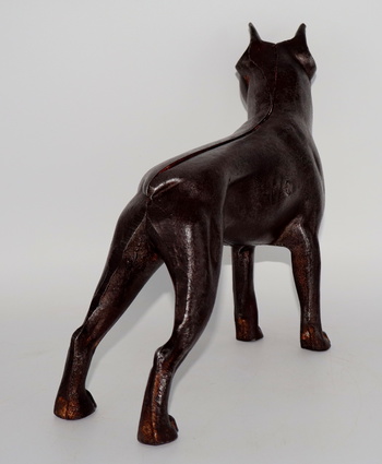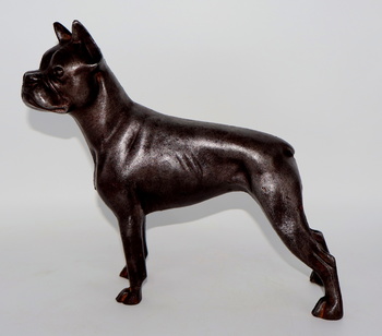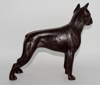 Another cast iron dog doorstop that I recently acquired. This one is a Boxer and was made by Hubley in the early 1900's and was cataloged as "Boxer" #307. This one is unpainted, but I have another that still retains most of it's original paint (pic #4). Though he's unpainted, he's still quite a nice example of the artistic craftsmanship of Hubley's line of products. As you'll see in pic #2, he's a two piece design held together with a single screw. These Boxers carry a fairly high value, even unpainted. He measures 8 1/2" tall and 9" long. He weighs just under 4lbs.