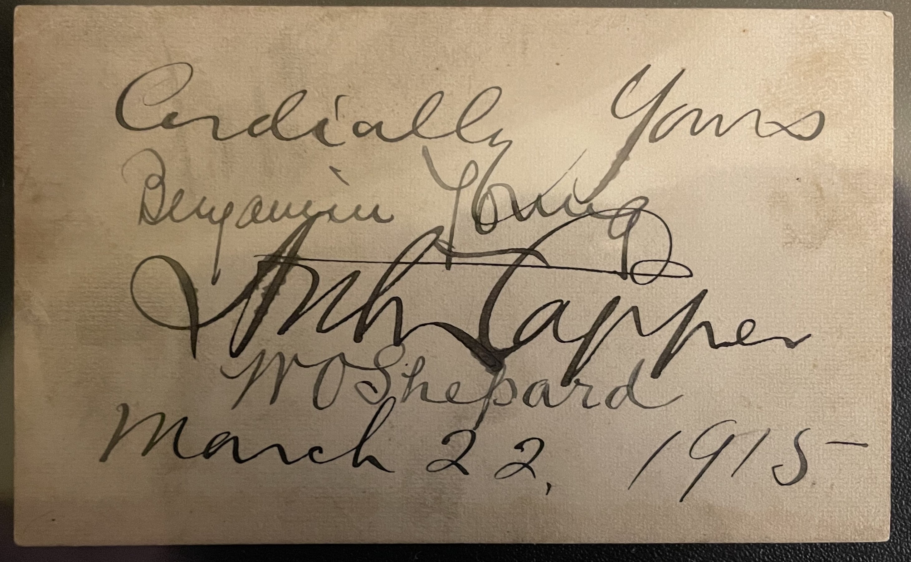 The second and third image are of one card of 'The President', again, Woodrow Wilson, sending a calling card to the Rev. W. M. Long in Kansas, January 5, 1915 on which a note is hand written by staff saying The President 'appreciates and cordially reciprocates your kind holiday greetings', a most unusual use of the presidential calling card. Even more so, on the reverse (image three) is the signature of Arthur Capper, the governor of Kansas writing 'cordially yours' along with two unknown signatories dated March 22, 1915 probably presented to the governor by the Reverand for an autograph. So who are the two signatories, Benjamin Young and W. O. Shepard? If you know, write a comment below.