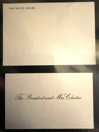 The last set of calling cards are more recent, that of President and Mrs. Clinton. Rather than two separate cards as before, the calling card, when sent as an insert to flowers or a large official White House Christmas card, for example, shows both names not just one. That custom has been followed by most presidents and First Ladies since at least the latter part of the 20th century.
