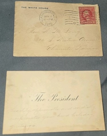 Still, a president or First Lady could makes themselves known to others simply by inserting a special card in a sealed envelope within a gift of flowers, for example, to show they were thinking of you. The first example is a set of calling cards titled 'The President' (it wasn't necessary to say which president; in this case it was Woodrow Wilson), Mrs. Wilson (no other name needed) and Miss Wilson. Curiously, the last is the most interesting of the three.