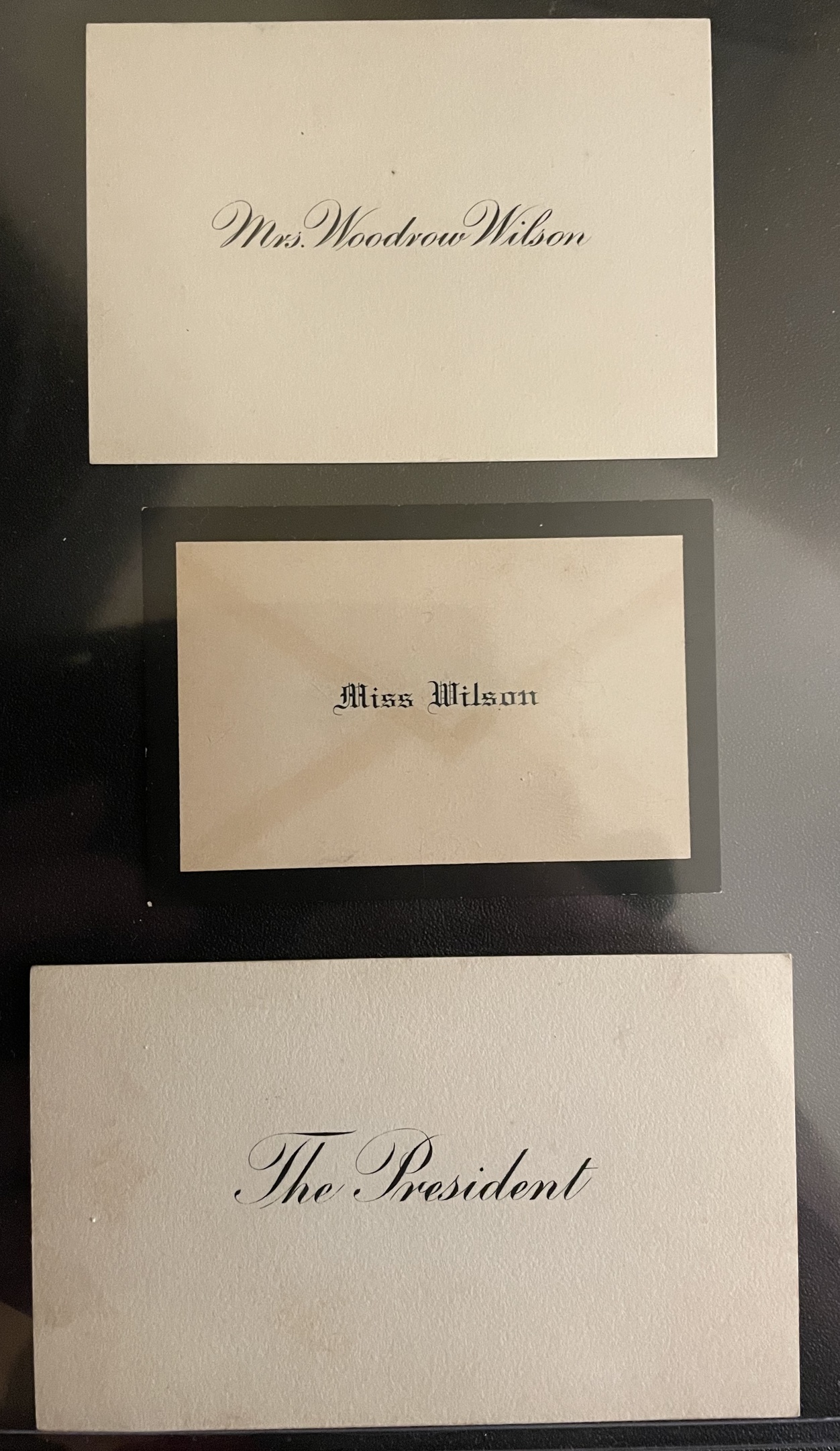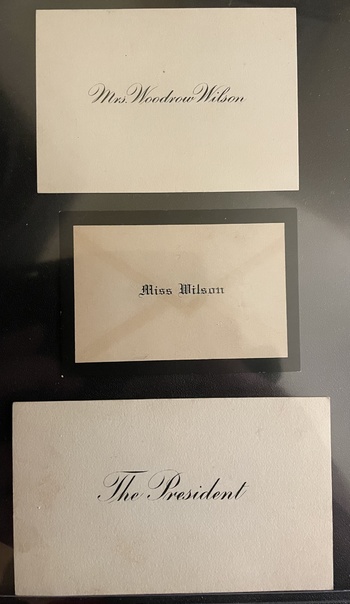 The first wife of President Woodrow Wilson, Ellen Axson Wilson, died of Bright's disease on August 6, 1914. We're certain that the calling card above is not hers, but that of the second wife, Edith Bolling Wilson, because of the presence of the third calling card for Miss Wilson.