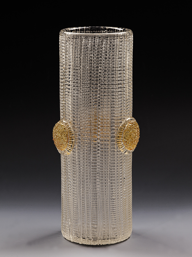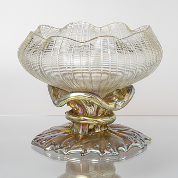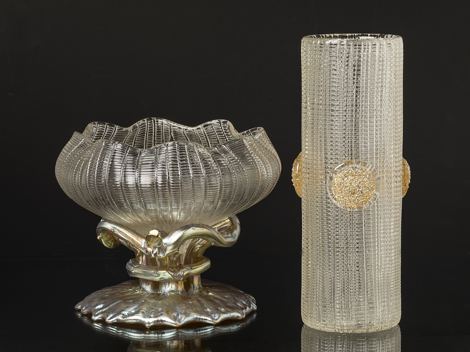 The common feature of the first “Ausführungen” is crystal as the base glass. Although Ausführung 1 up to Ausführung 5 are noted on approximately 250 paper patterns, only a few seem to exist today. I am only aware of a single example of Ausführung 1, which is now part of an important Czech glass collection. Here, a crystal thread is spun densely onto the base glass (»kristall dicht gesponnen«). Several round applications with “gold crumbs” complete the decor. In Ausführung 2, a smooth crystal thread is spun horizontally and vertically without the crumb applications. In 1908, Lötz used Ausführung 2 for vessels with intricately designed silver feet. They form a very unique group of art glasses. I am very grateful to an American collector who recently sold me her bowl in Ausführung 2 with a silver foot (PN II-6240). It is now on display in my collection together with a cylindrical vase in Ausführung 3. Ausführung 3 also features the horizontally and vertically spun crystal threads together with the “Gold Batzen” applications known from Ausführung 1.