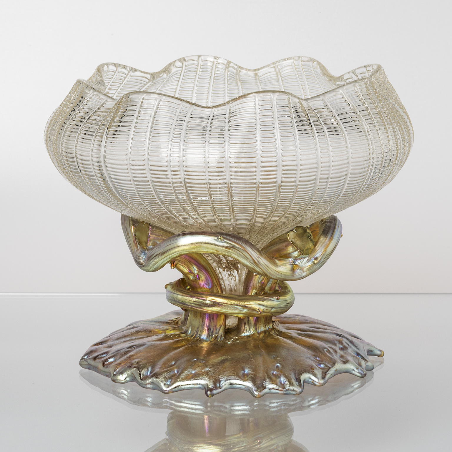 The Johann Lötz Witwe glass factory has followed various paths to designate its decors. The best known are probably »Papillon« – an example of proper names – and »Phänomen« glass, an example of decor groups. The latter are more diverse and were given genre numbers to distinguish them (e.g., Phänomen Genre 6893). However, Lötz was not very consistent in its decor names. A few Phänomen Genres were given proper names such as »Argus« and »Medici«. In contrast, »Cytisus« and »Maximia« have all the characteristics of a phenomenon decor, but were never listed as such. For rarer decors, Lötz completely dispensed with names and described them only by the type of design, e.g., »opal gradient with green leaves and red flowers« – a decoration using the marquetry technique.