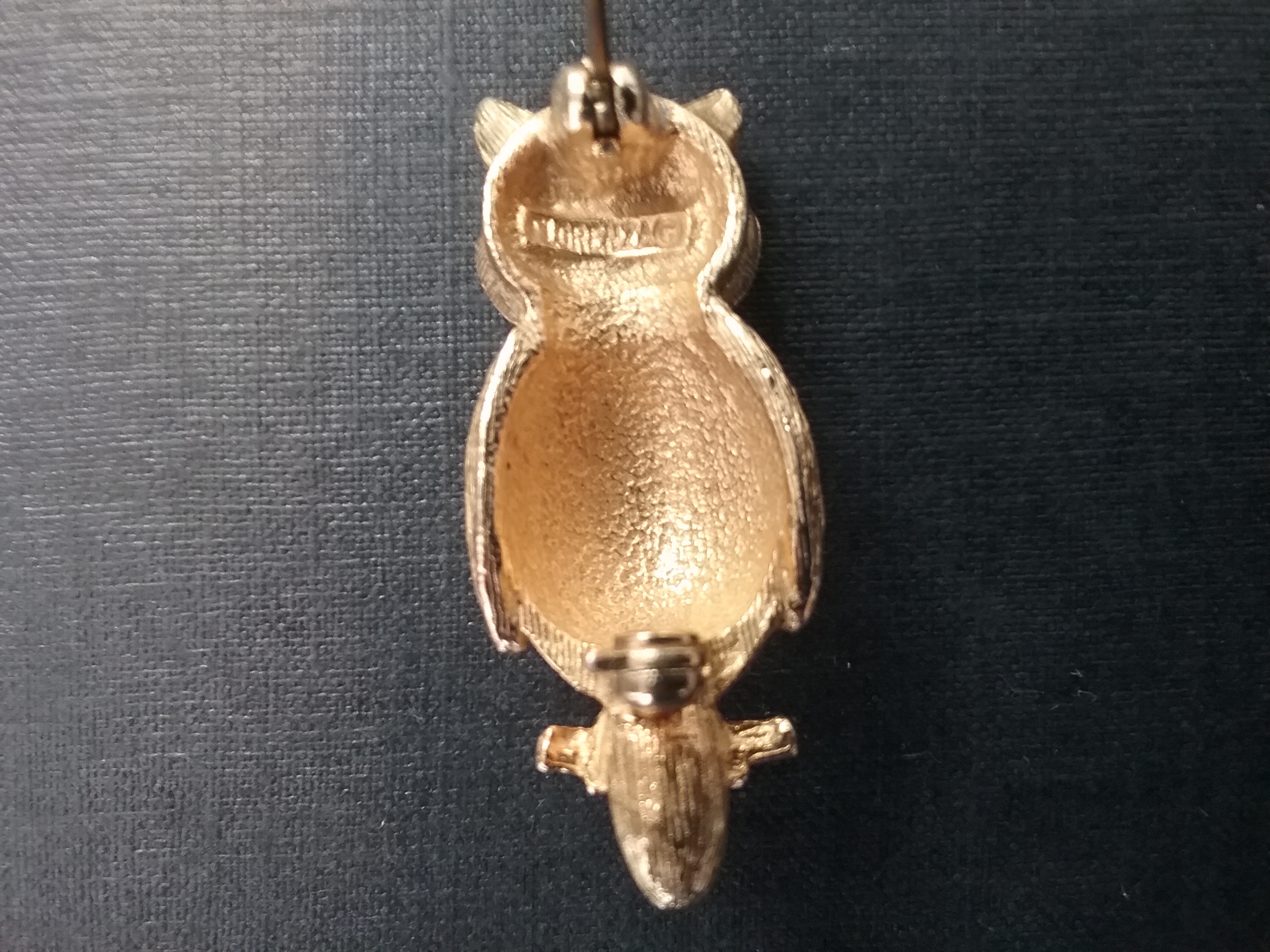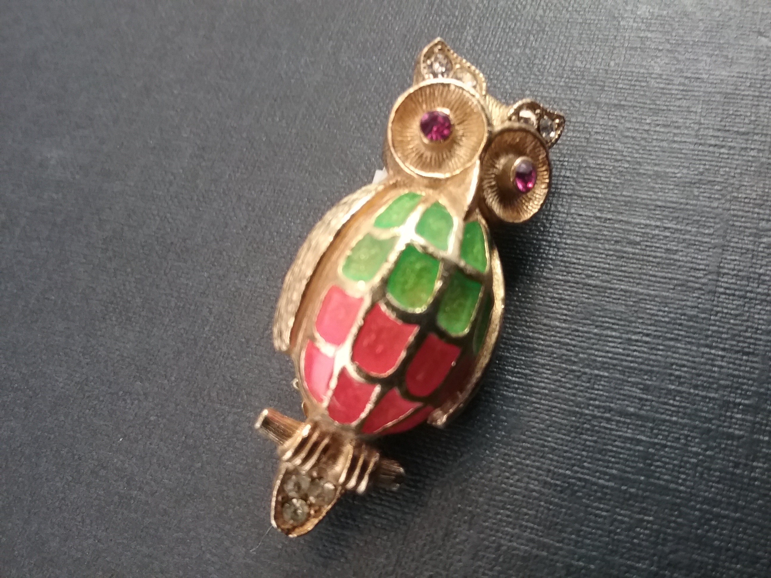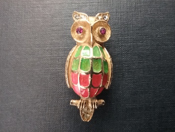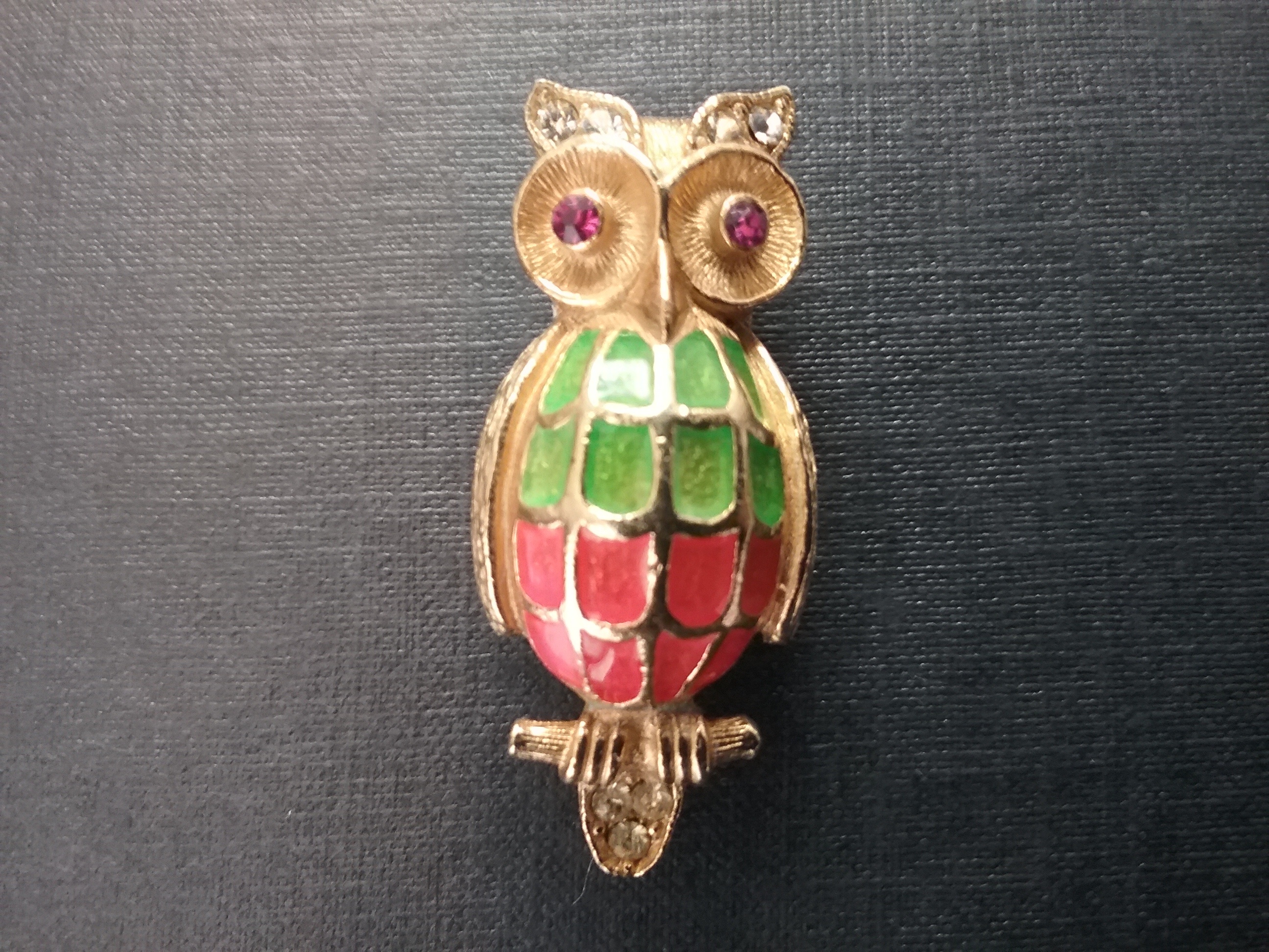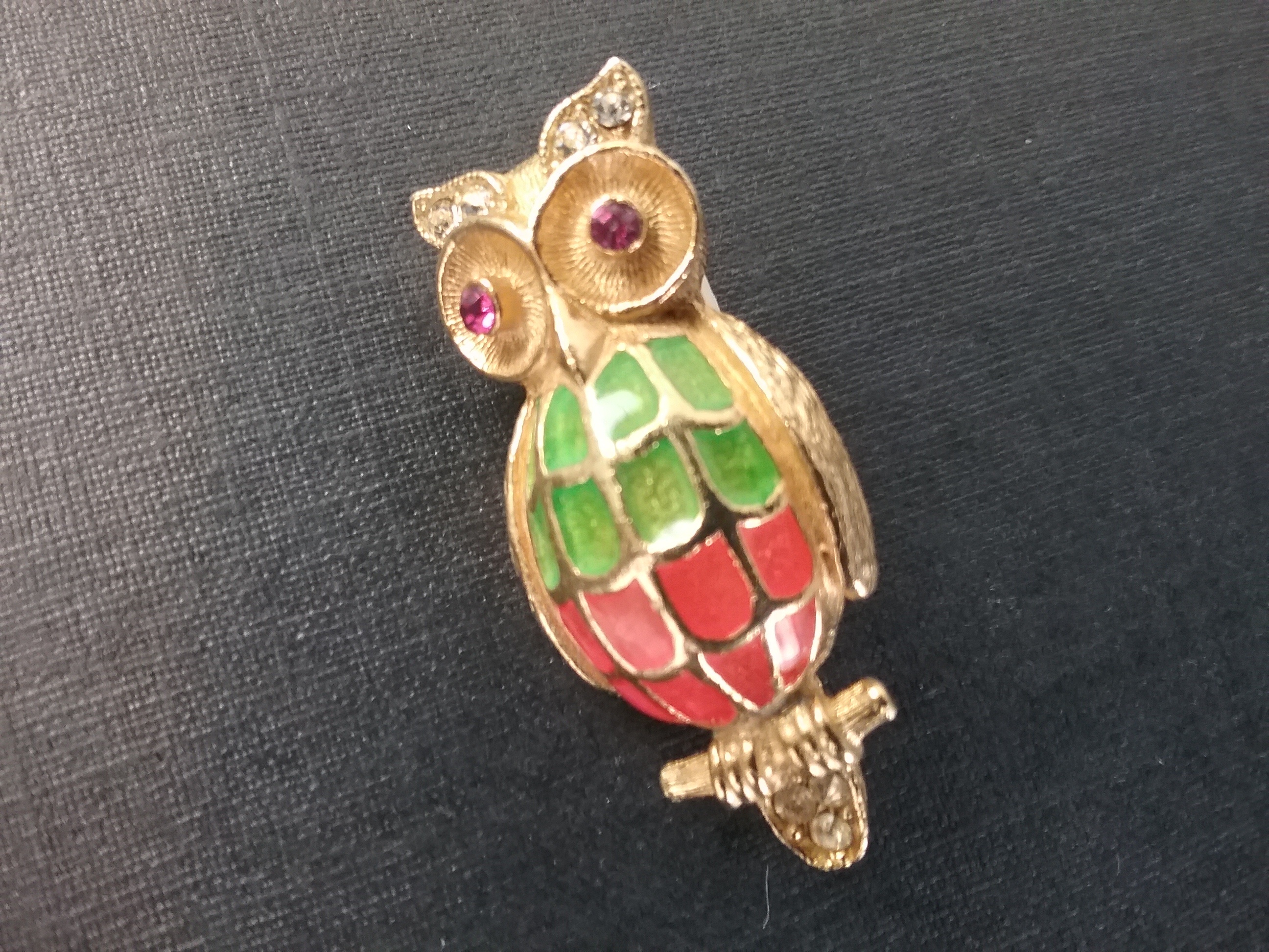 This 1 3-4"L goldtone horned owl brooch has a patterned cage type body of red and lt green enamel, with two pink rhinestone eyes & white stone accents. Marked Florenza in bar on the back, ca 1960s