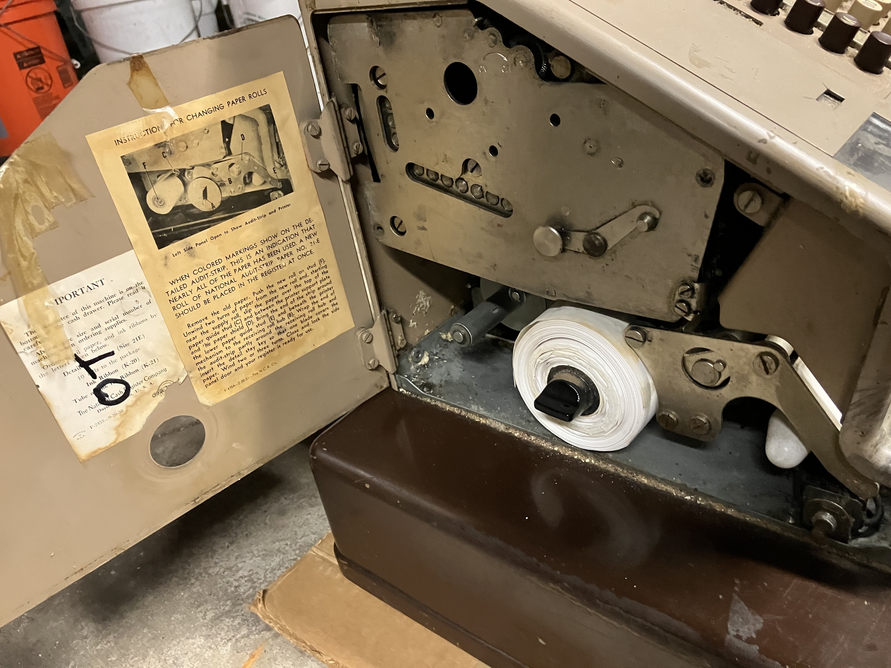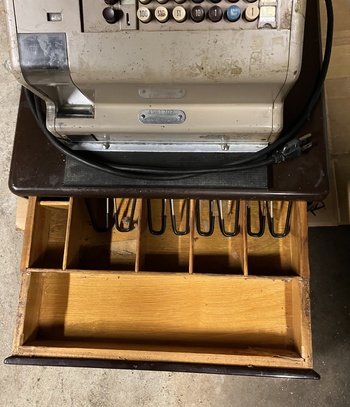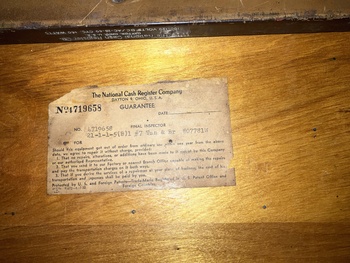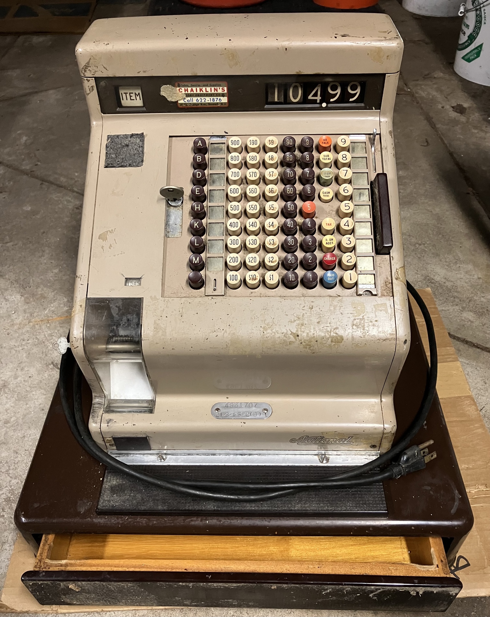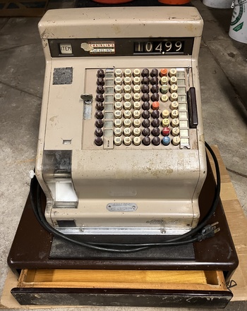 This is an electric National Cash Register from sometime between 1943 to 1963, going by the “zone number” address on the label affixed to the bottom (Dayton 9). It’s made of metal and quite heavy, about 80 lbs. Any idea of a more precise date?