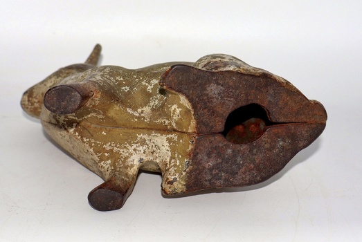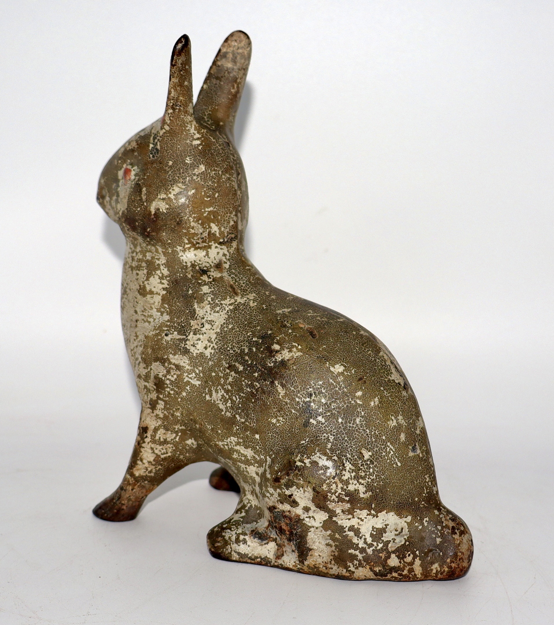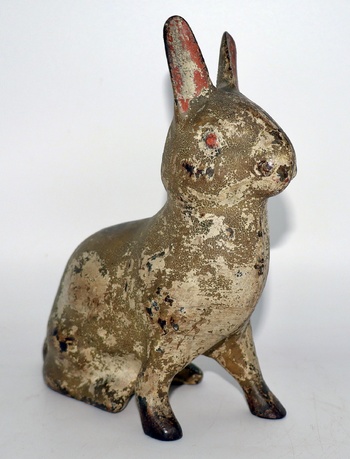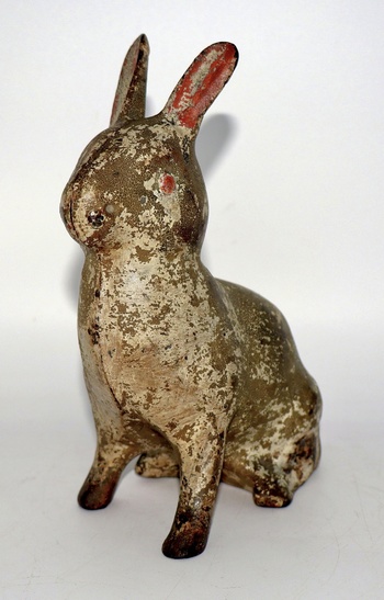 I haven't posted a cast iron rabbit in a while, so here's one of my rarest cast iron rabbits. Though it doesn't look like much, it's pretty rare and very old. This one dates back to the late 1800's. The original paint has developed quite a nice patina throughout it's 130+ years of life. It even retains some of it's original pink paint inside the ears, it's eyes and a bit remaining on it's nose. This one is by an unknown foundry as there are no markings to be detected. It measures 6" long, 6 3/4" tall and weighs 3lbs 7oz.