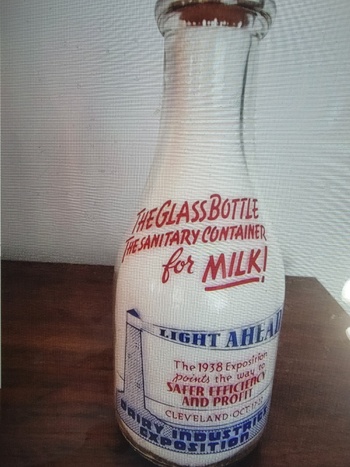 Pictured here is a 1938 OWENS-ILLINOIS DAIRY INDUSTRIES EXPOSITION milk bottle. These bottles are highly collectible and rarely offered for sale. They are super additions to a collection if ever found.