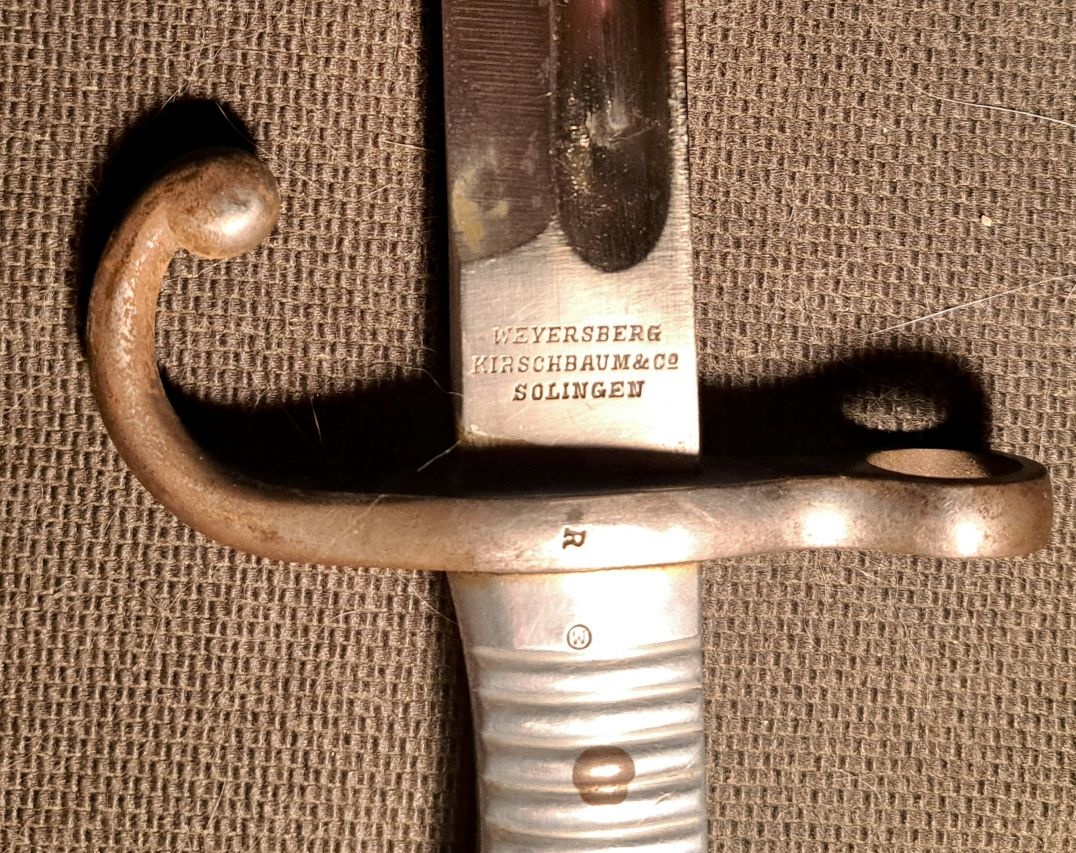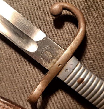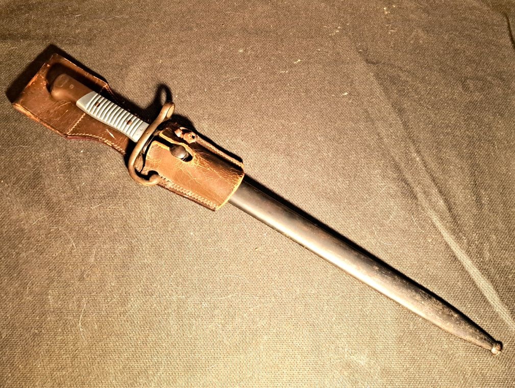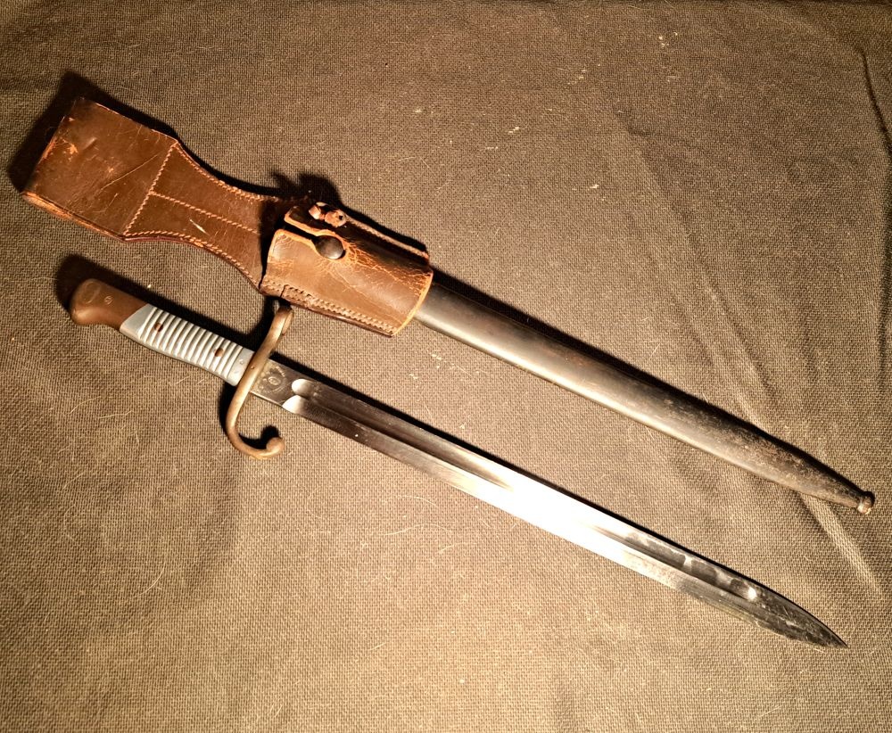 This is an Argentine model 1891 bayonet made by Soligen for the Mauser rifle. This version was made from 1893-1901 and the serial numbers on the scabbard and blade match. Plus it has the leather frog which is a big plus. The blade itself is in excellent condition. The blade is 16" long which is not all that long for the time. Also fairly light for a bayonet that size.