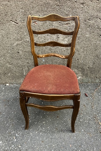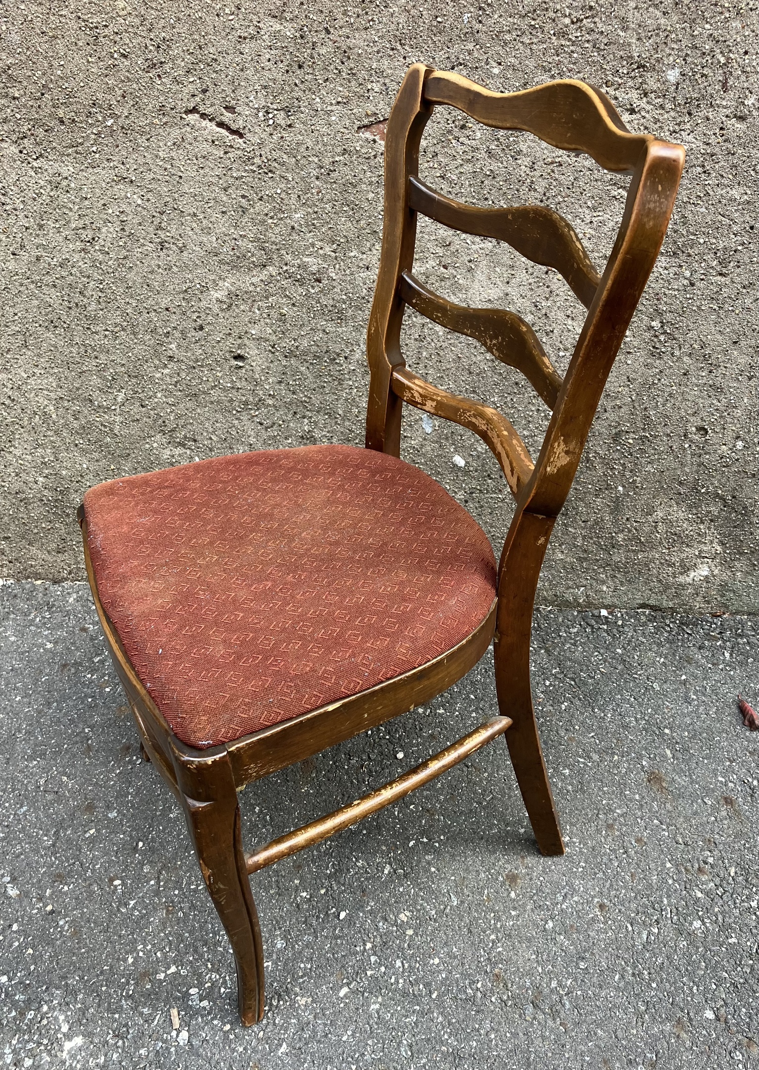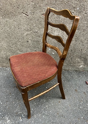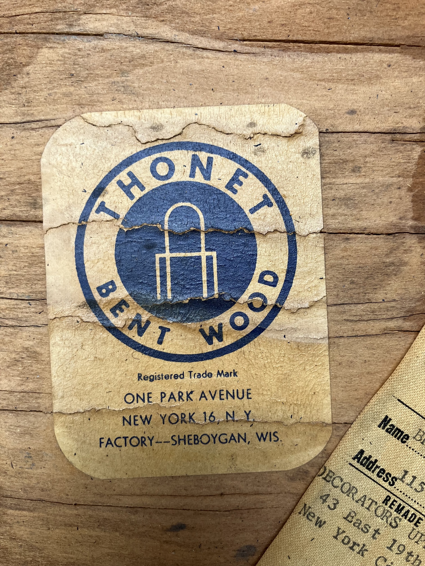 Michael Thonet invented the bentwood furniture process in the 1840s. This is a cushioned ladder back side chair from between 1943 and 1963 judging from the “New York 16” postal code (today’s 10016 zip code) and a postcard photo of the Brussels Restaurant that was at 54th Street and Park Ave in Manhattan, which used to own the chair, showing it in its former setting. Any info to further pinpoint a date is appreciated