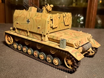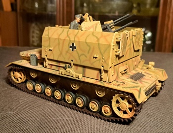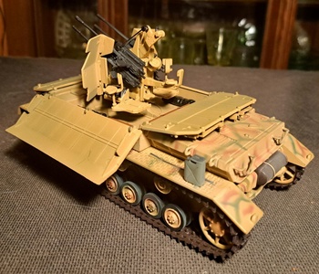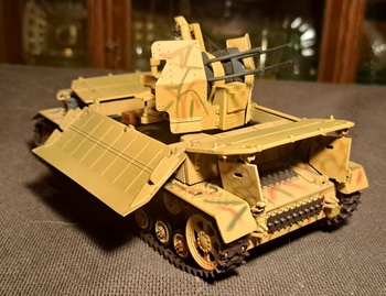 This model is a WWII German anti-aircraft armored vehicle. It is built on the lower hull of a Panzer IV tank with a quad 20mm cannon on top. This version has armor plates that fold down for the gun to be used. It was called the Furniture Van due to the boxy shape. These were often used against ground troops. It had a crew of 6 Two of them reloaded the guns which took a lot of reloading. The other crewmen were driver, bow gunner, main gunner and commander.