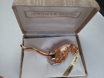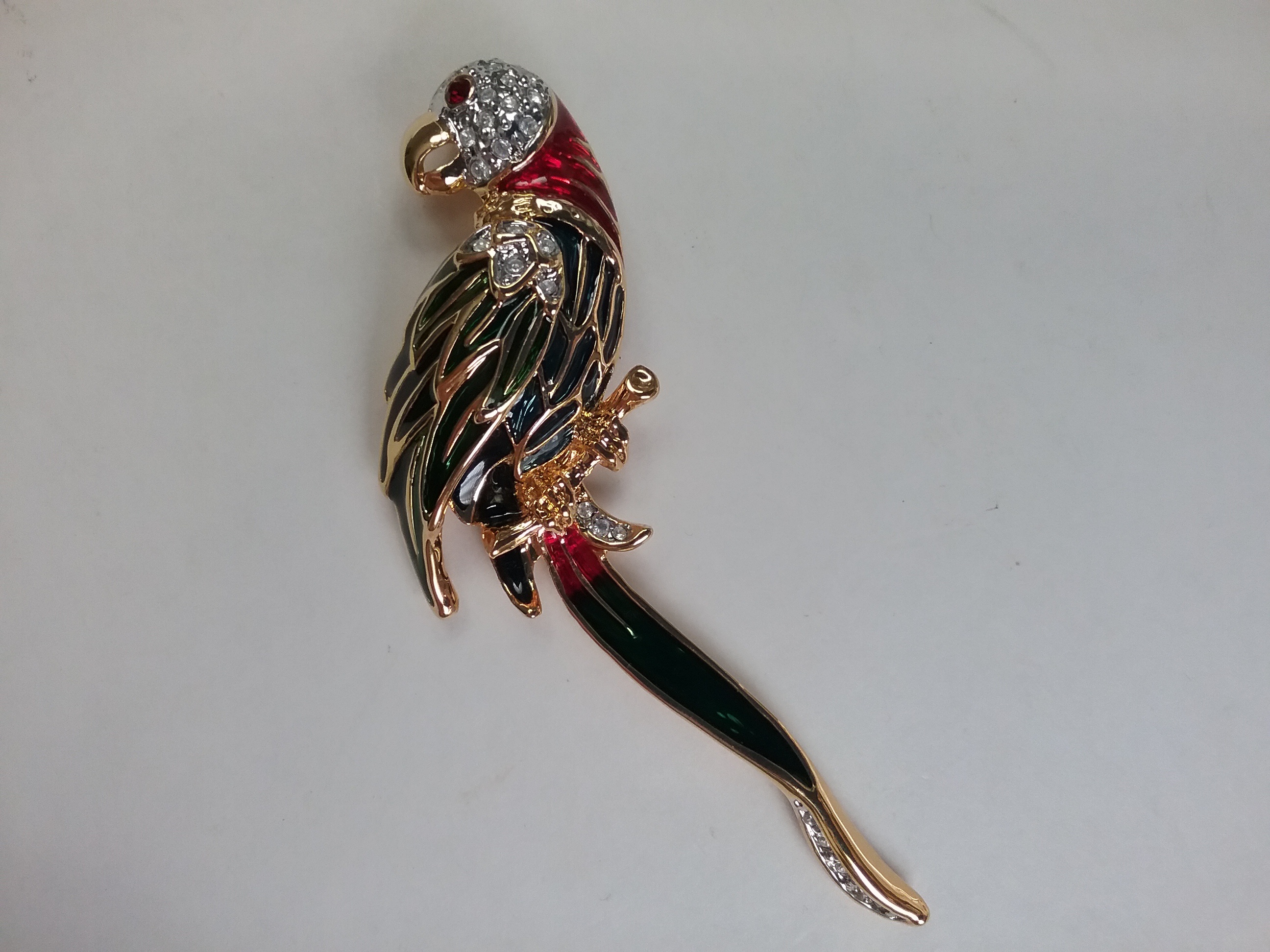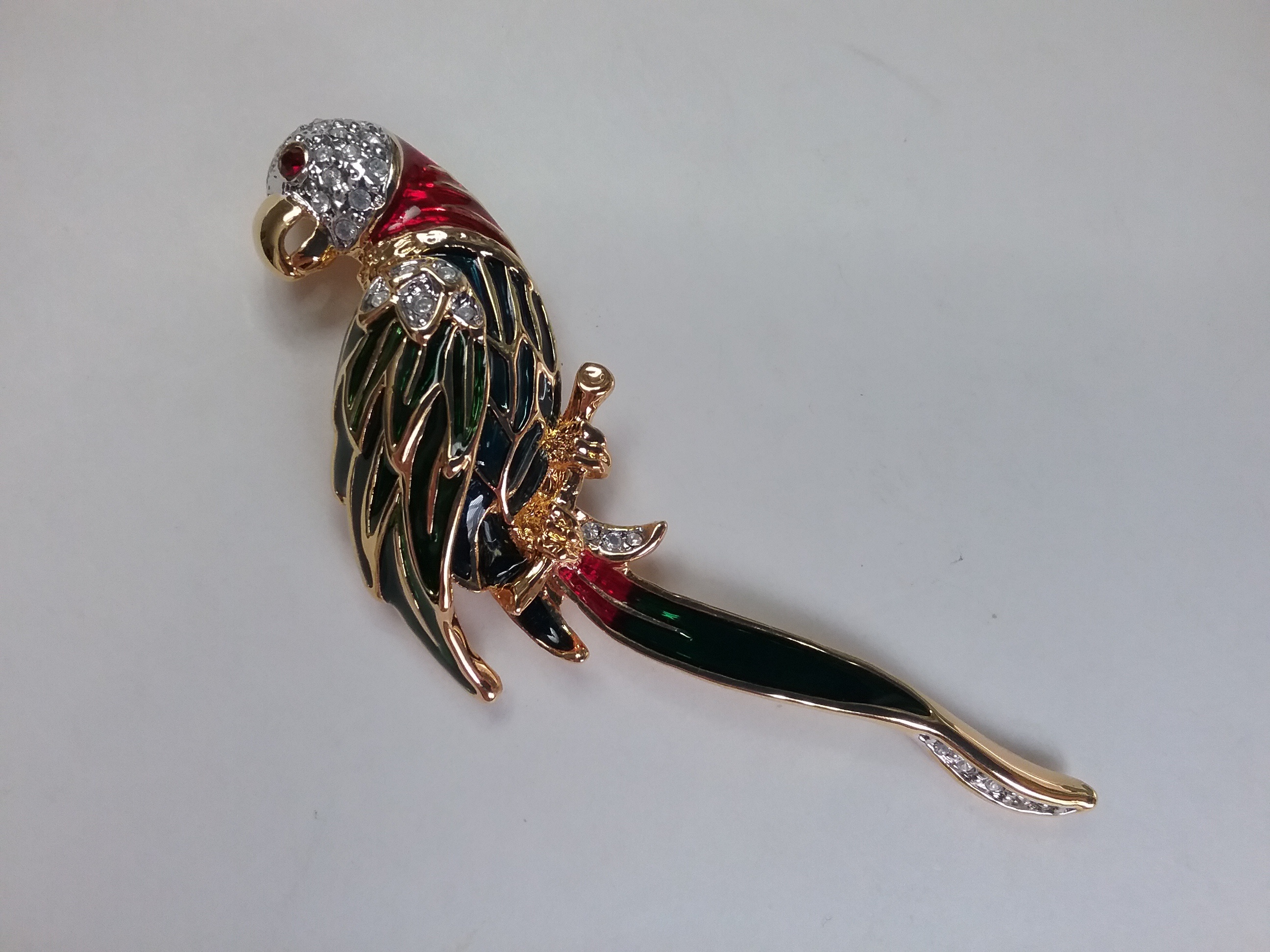 This 3 1-2"L goldtone parrot brooch has bright red, blue & green enamel, with small white accent stones and one red eye. From Jennifer Moore ca the 1980s