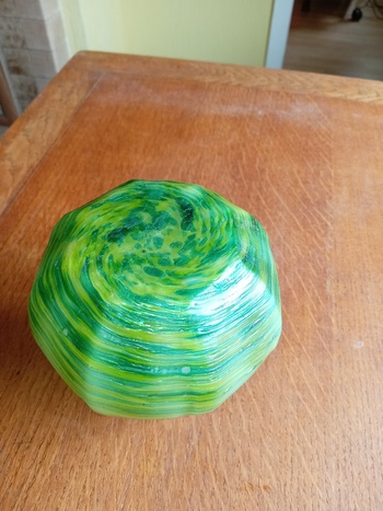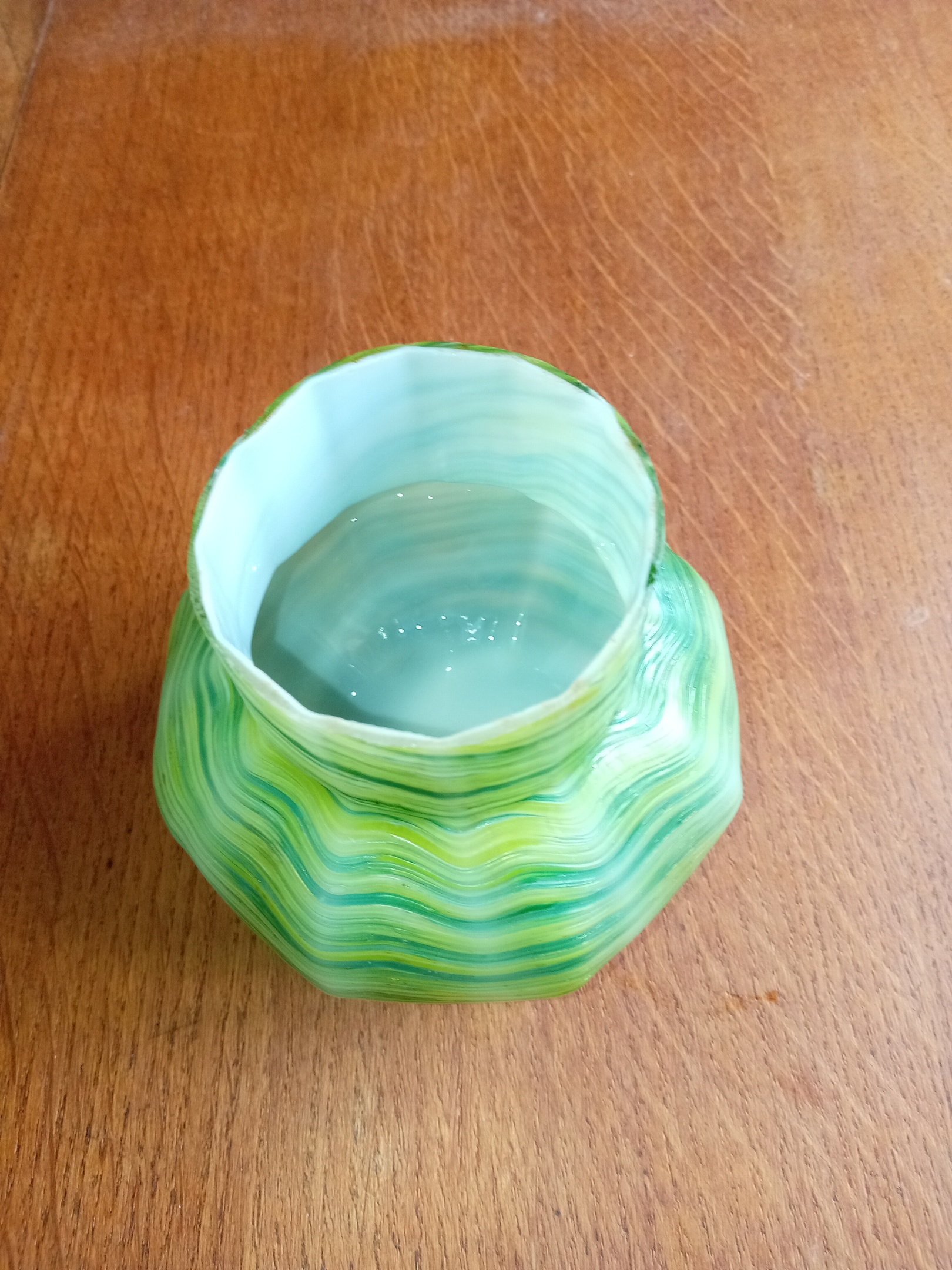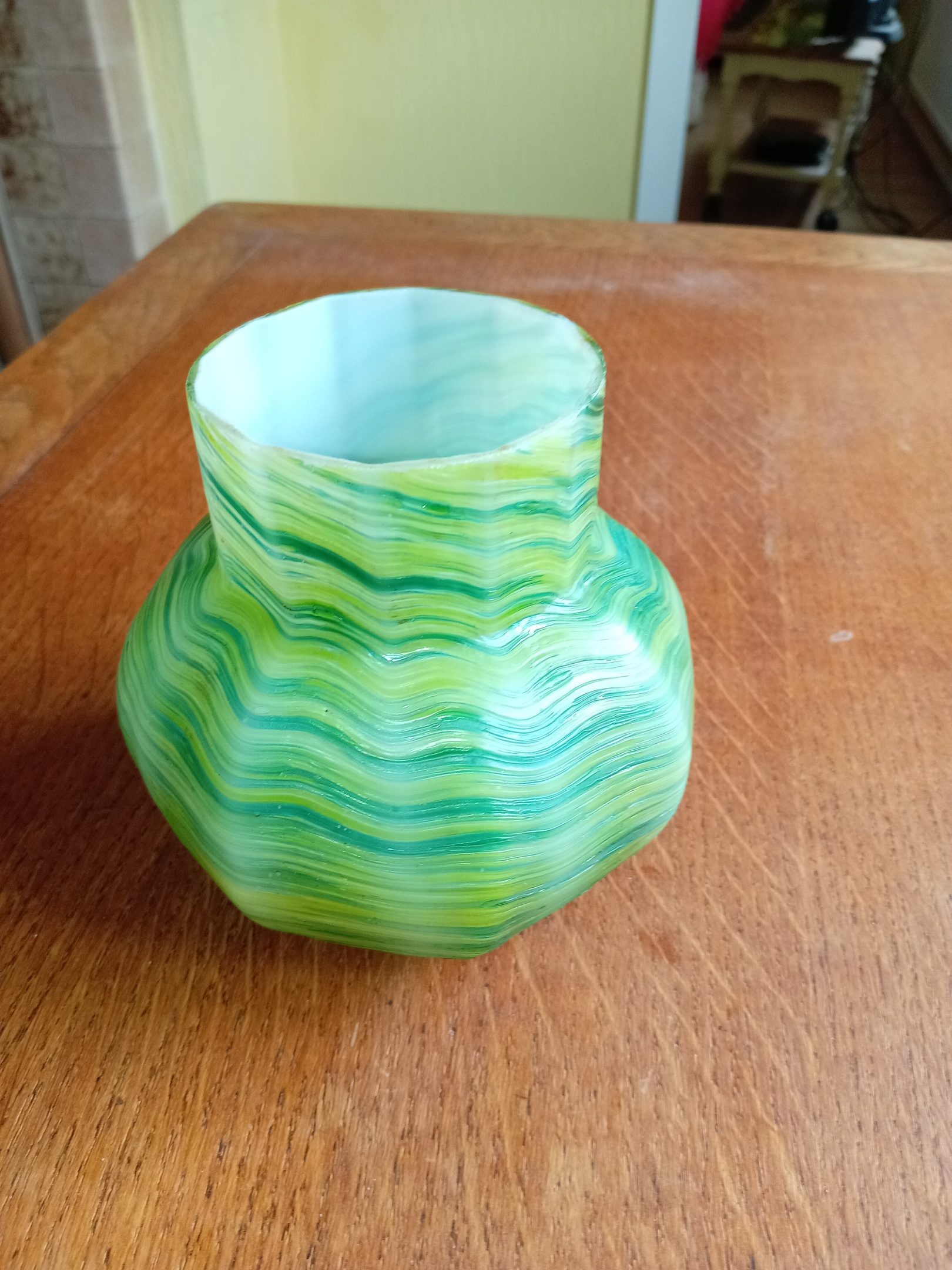 I have one like this, mine is more yellow than green, but the swirled, striated decor & shape are the same. When I bought it, I wasn’t sure of the maker, but now I feel it may be Welz. Still not 100% certain, but Welz did produce a variety of similar swirled striated decors.