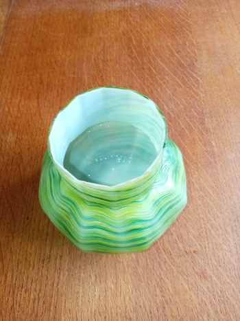 I bought this as I was curious about the unusual decor, not one I'd seen before and I can't find one the same, I can't think how it ought to be described. I think definitely Bohemian, around 1900-1920, possibly Kralik or Welz?, height 5".