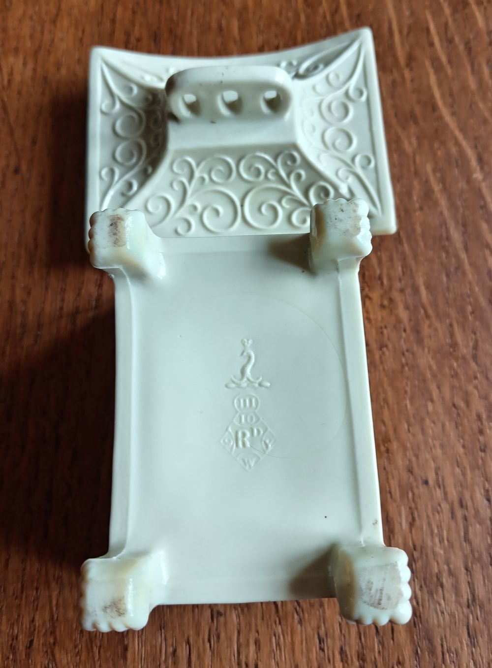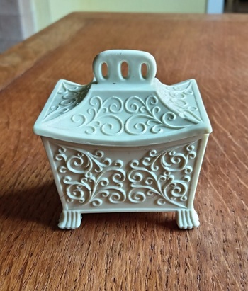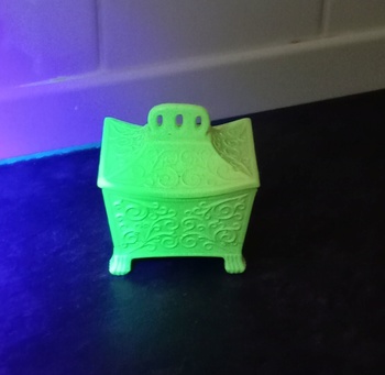 This is a lovely, rare Sowerby No.1388 "Tea Caddy". Only 3" long, it is in the shape of a tea caddy in the Japanese Aesthetic style. Made in uranium Queen's Ware glass it carries the Sowerby peacock mark and the registration lozenge for 10th., W/March, Y/1879 and Parcel 9, Rd.No. 333170. Shown in the 1882 catalogue.