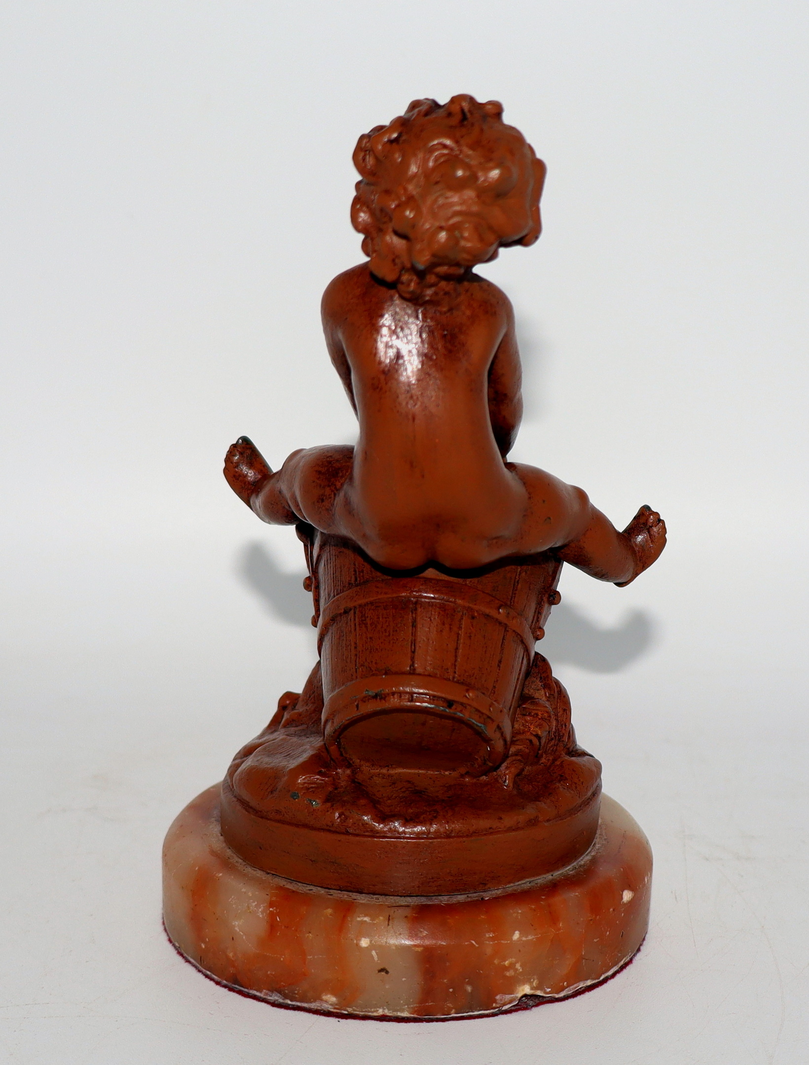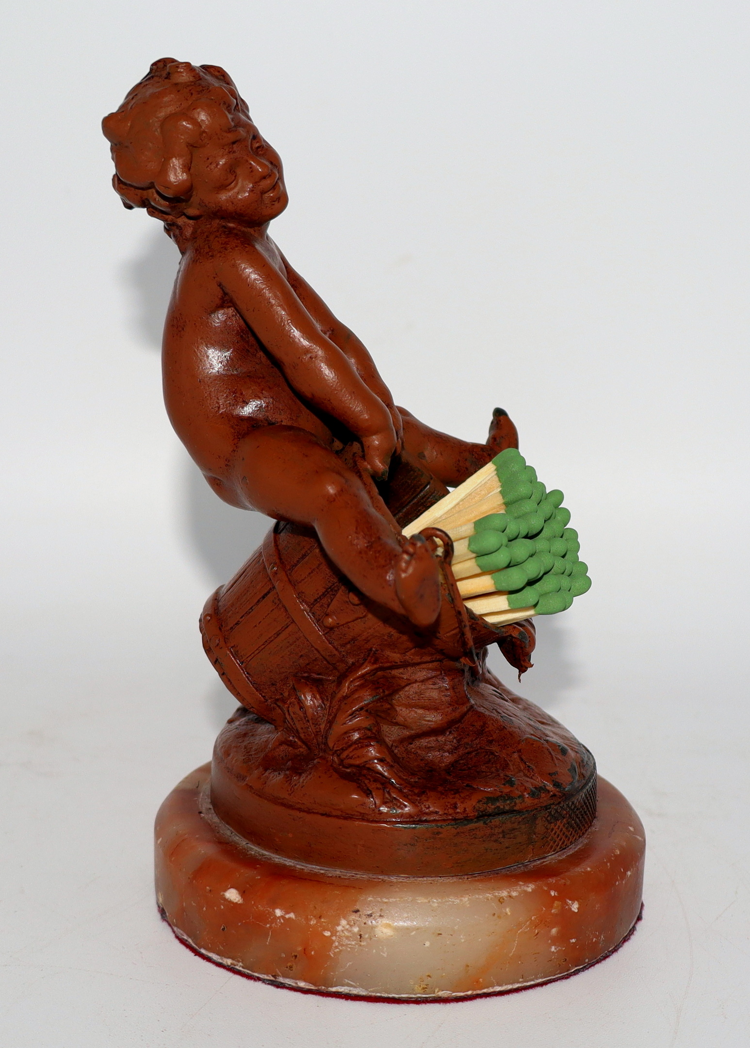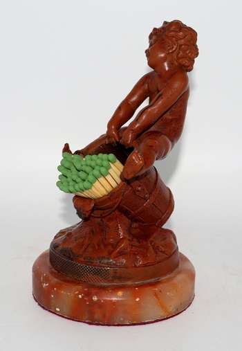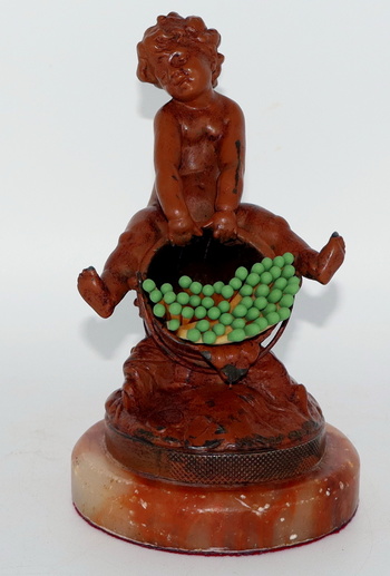 It's a rainy Sunday morning here in the Bluegrass state, so I thought I'd take a moment to post another of my many match holders. This one depicts a child (possibly a putti) straddling an old bucket. It was made sometime during the last quarter of the 19th century, possibly even earlier than that. The child is very nicely detailed from his head to his toes and I love his expression.