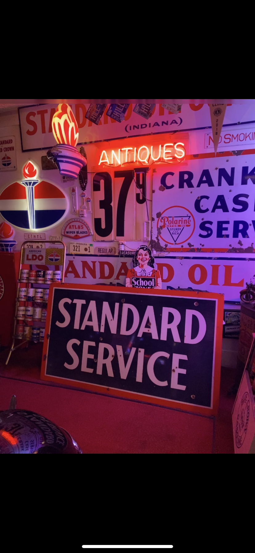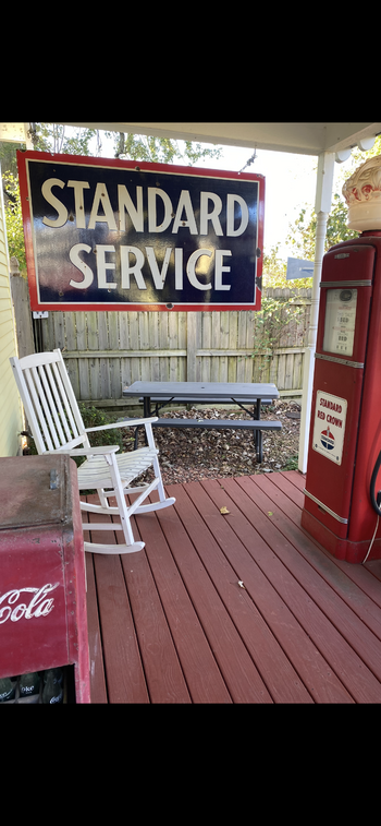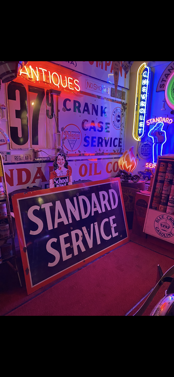 Another great sign found at the Cover Bridge Festival this week was a 1930’s Standard Service double-sided porcelain sign made by the Standard Oil Company. You’re seeing both sides of the sign sitting in the garage. I think it’s in great shape for being almost 100 years old. Another great sign added to my collection. You never know what will turn up at the Covered Bridge festival or any event. Glad I took the time to go down for a few days and look around.