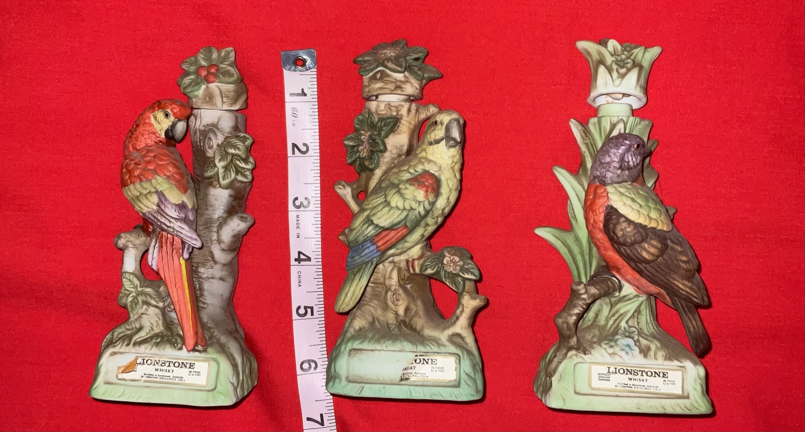 Lionstone Porcelain Whiskey Bottles featuring birds from around the world.
