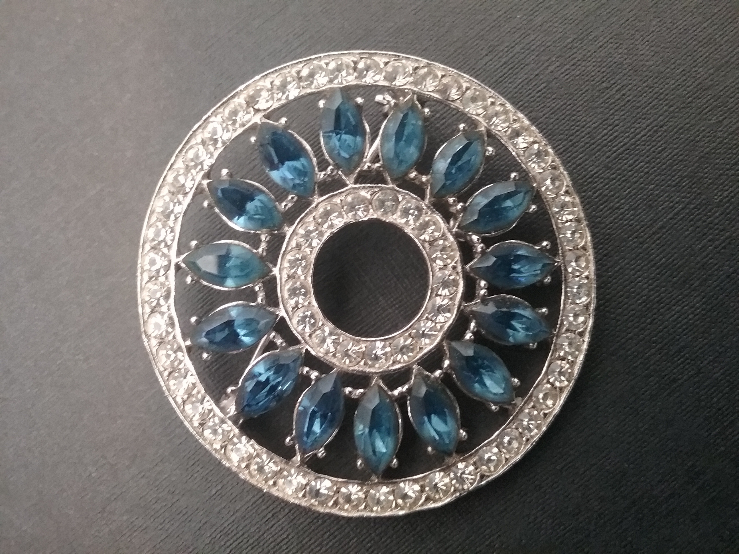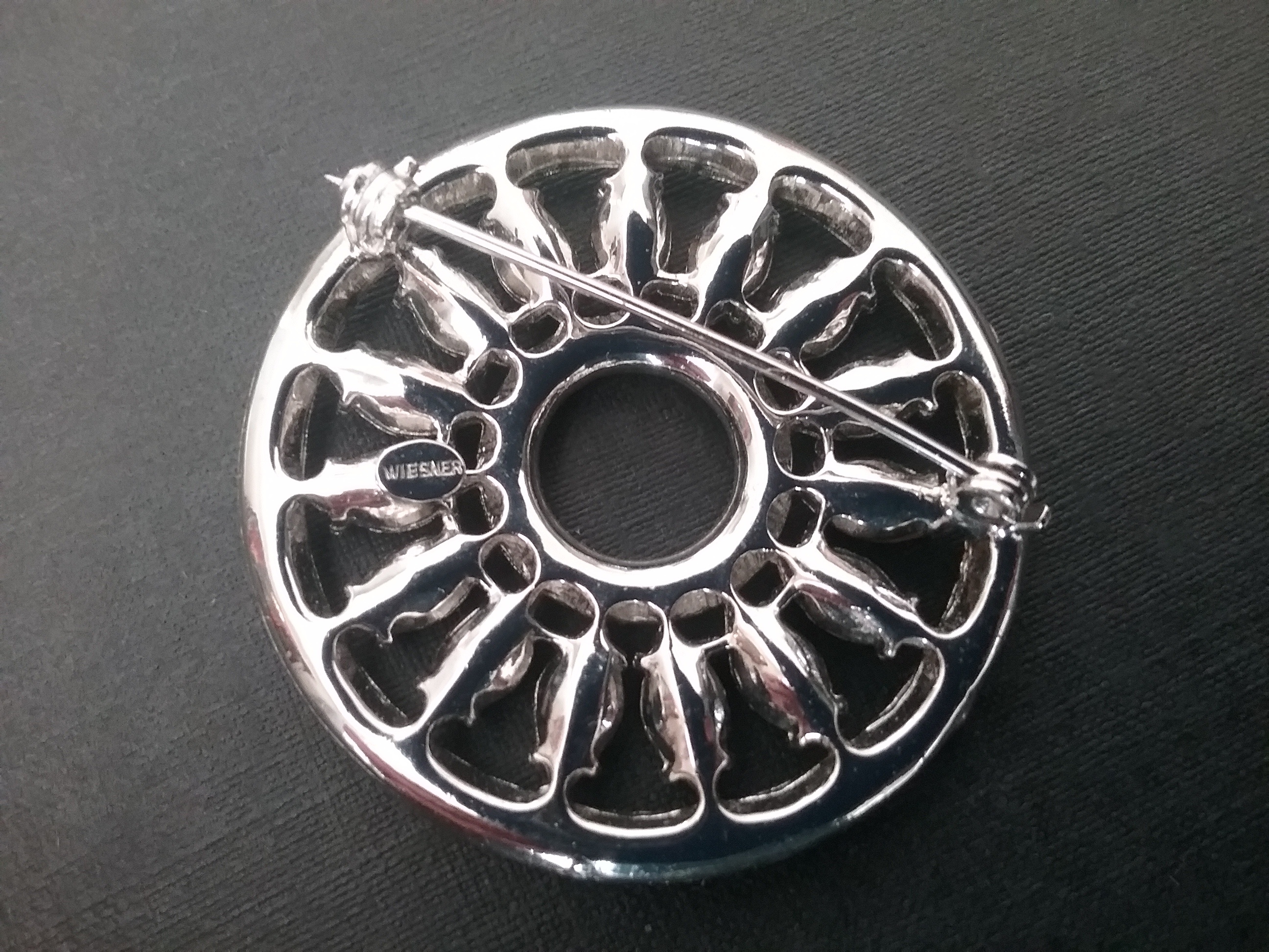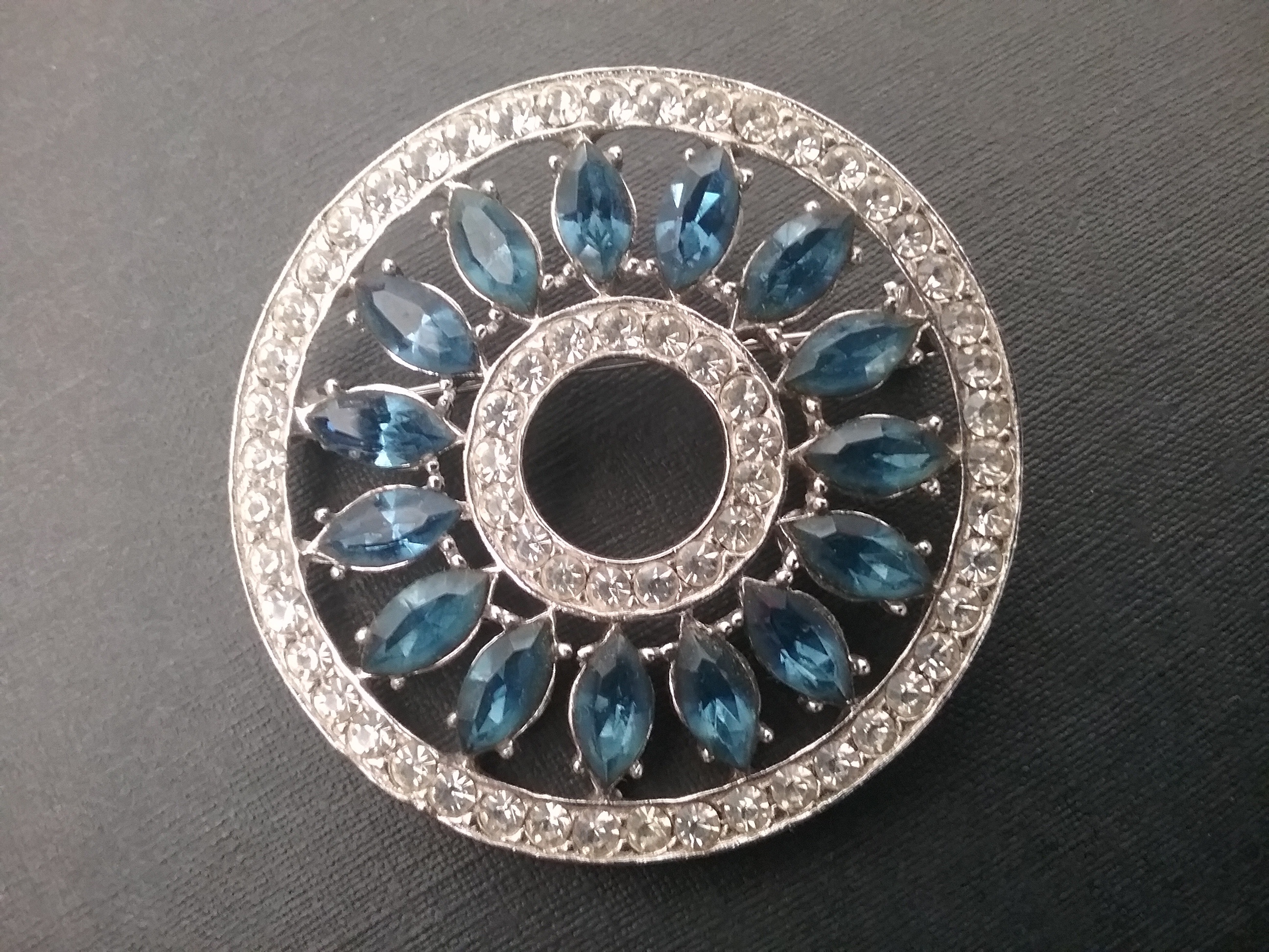 This 2" silvertone circle brooch has a wheel type design, with deep blue marquise & small white rhinestones. By Wiesner of NY ca the 1950s