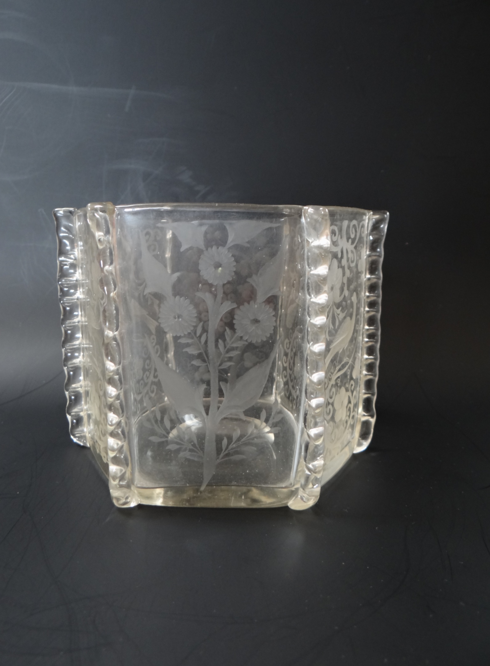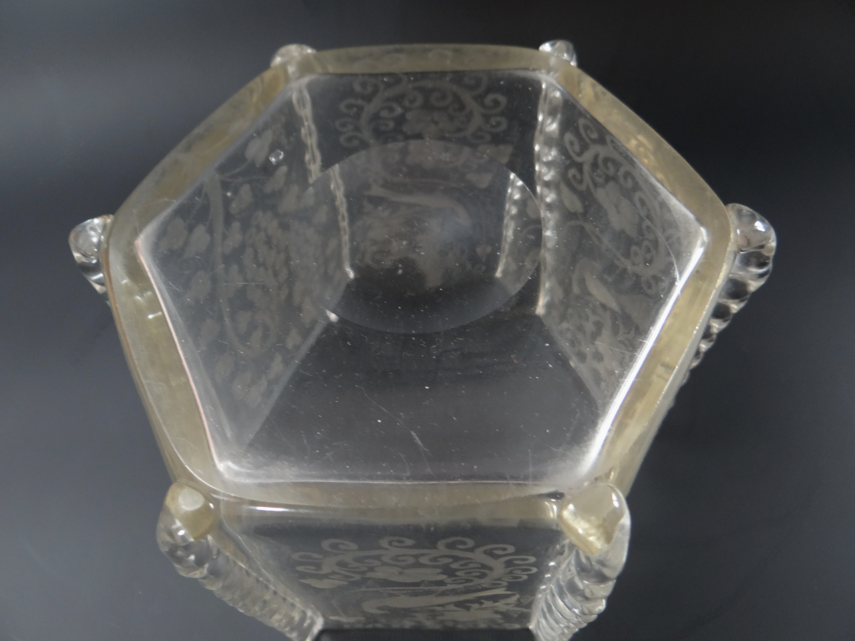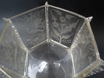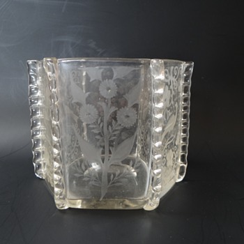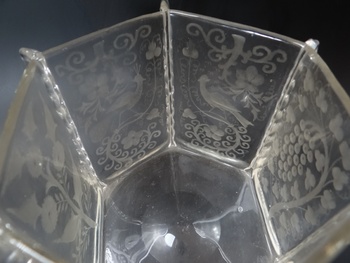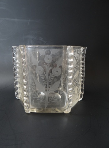 Vase (or bowl) crystal glass with engravings of peacocks, pheasants (?) and flowers. This is a product of the Loetz glassworks for J. & L. Lobmeyr, Vienna, or possibly for the company Lobmeyr's Neffe Stefan Rath Kamenický Šenov (Steinschönau). Shape II-7943 (year 1911). This shape is sometimes attributed to Franz Hofst'otter (?). Decor perhaps Michael Powolny (?). The vase was probably made between 1915 and 1922. The same shape is known in the Ausführung 119 design. The same vase is in the Loetz exhibition in PASK Klatovy.