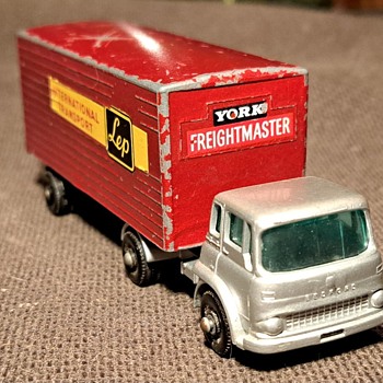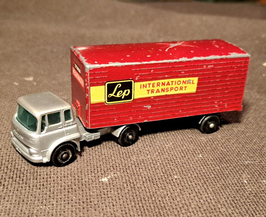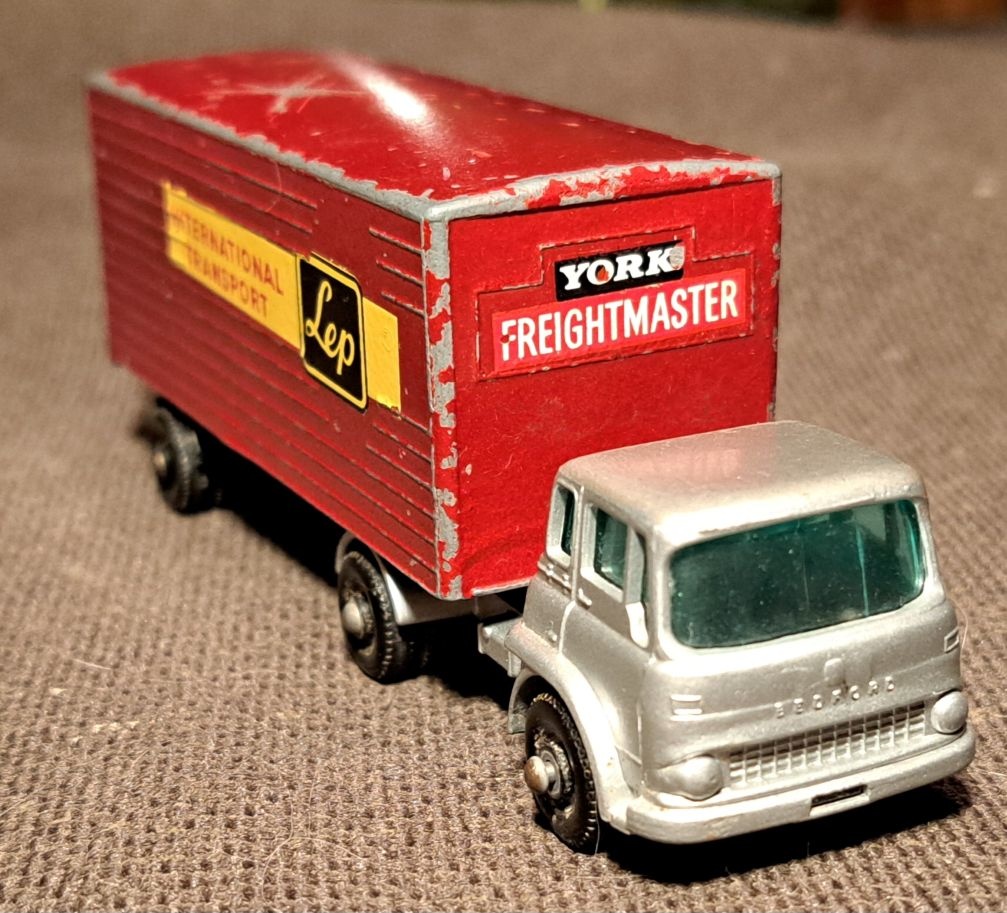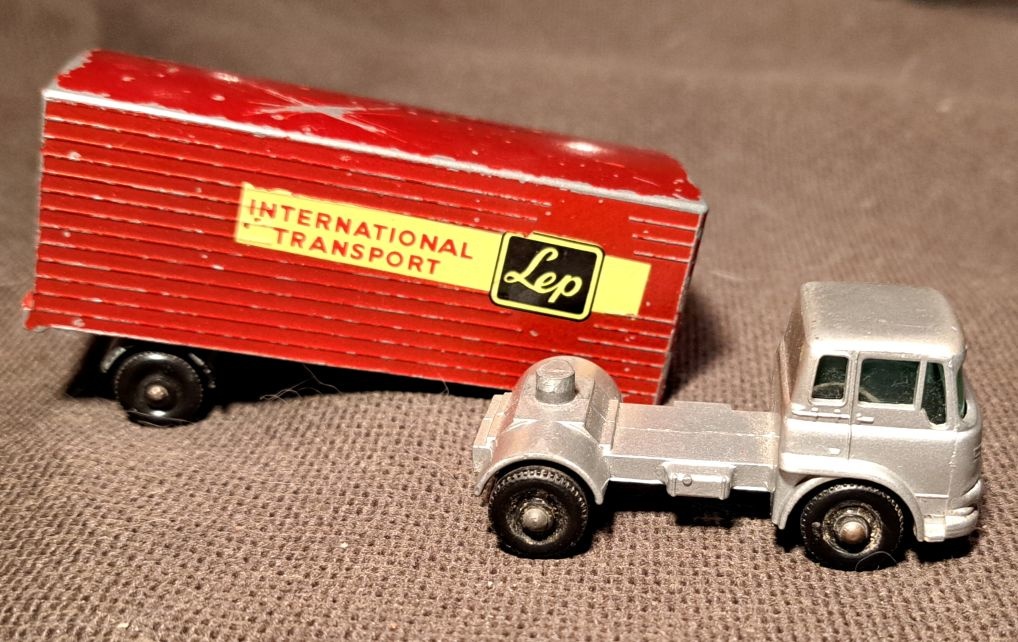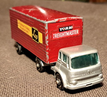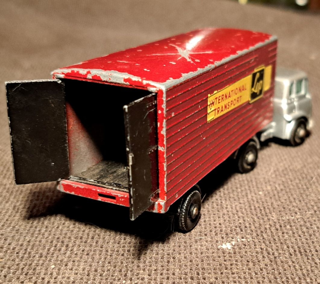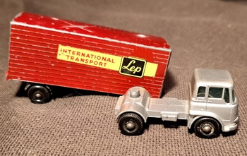 This is the second of two versions. The first version has a Davie's Tyres trailer. It was first made in 1961. In the 1965 it was changed to Internation Transport trailer. Still being pulled about by its Bedford tractor. The tractor can be separated although the trailer doesn't have the folding gear that would hold it up. As can be seen the rear cargo doors open and you stuff it full of stuff for maximum play value.