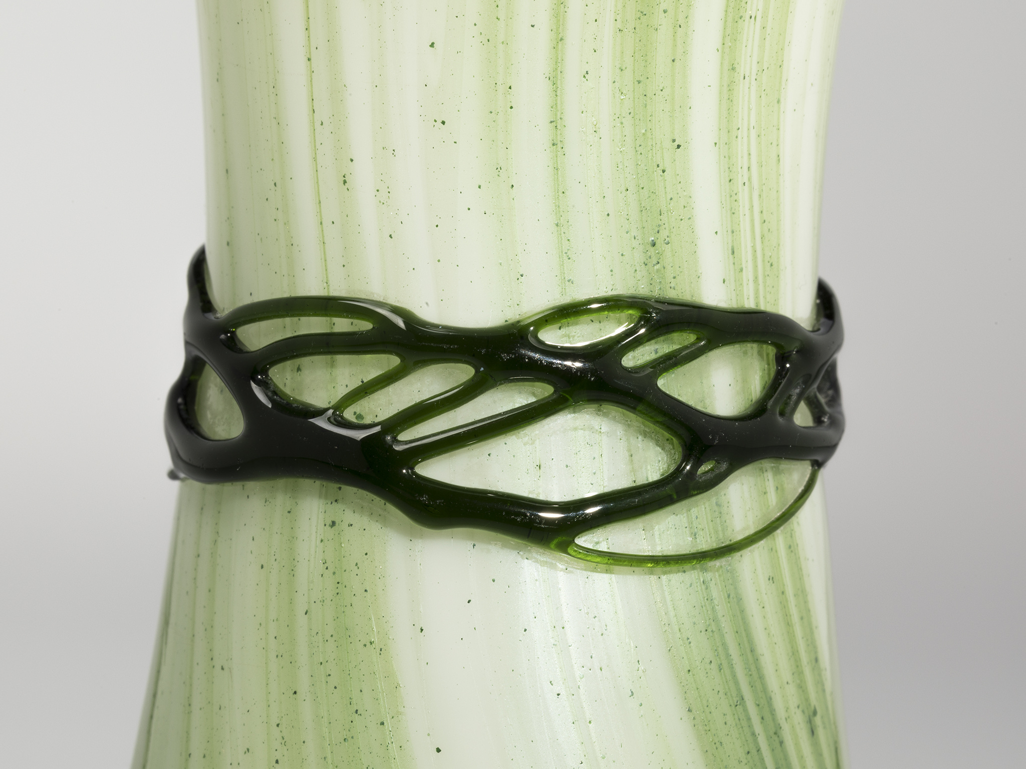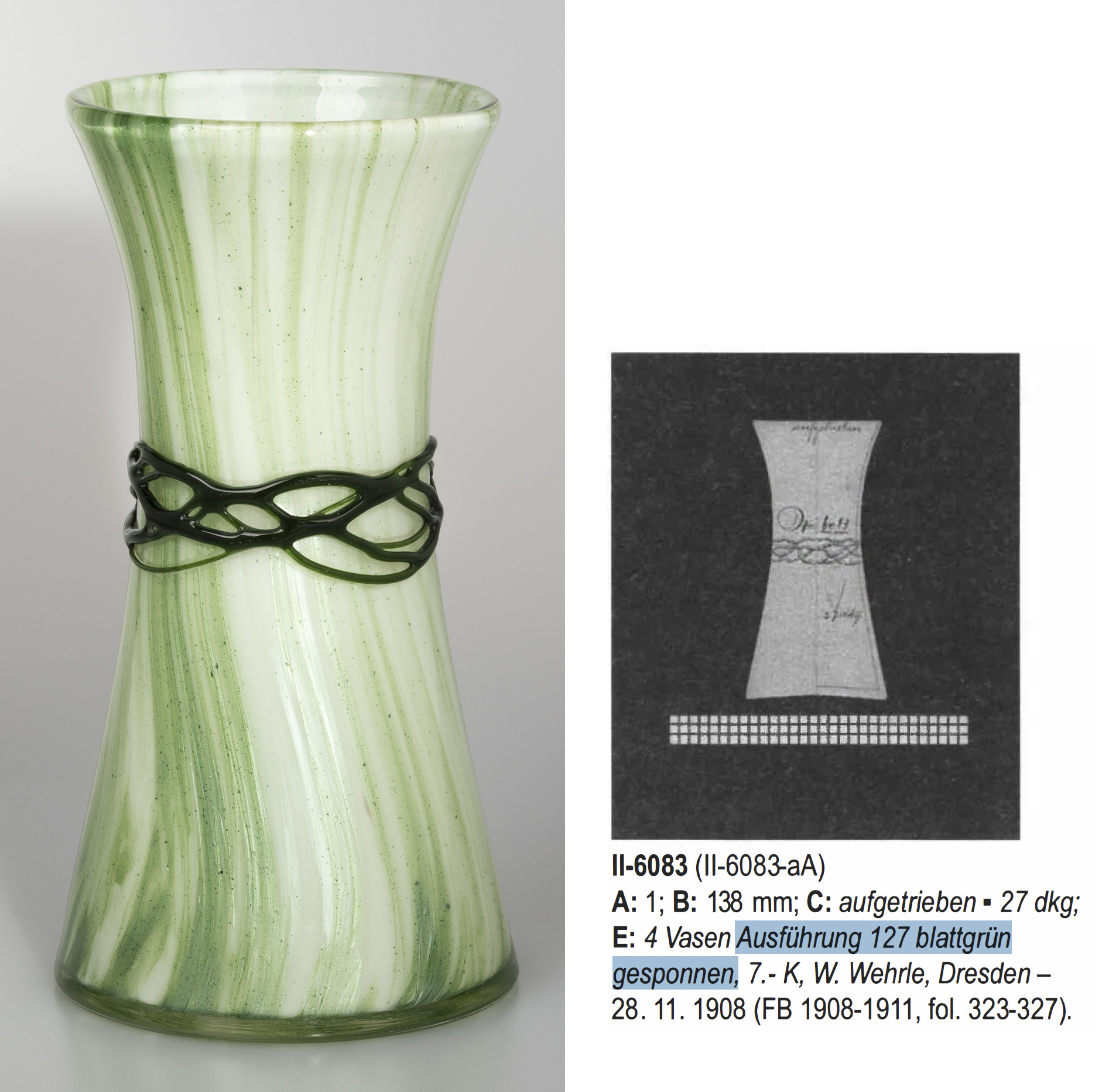 The shape, description, and size (14 cm tall) correspond to pattern II-6083. The drawing of the spun threads is particularly helpful. They are dark green in color. It is also helpful to be familiar with Ausführungen 15 and 25. They are characterized as “white marbled with green.” The marbling in Ausführung 15 and 25, created with green aventurine glass, are identical to the base glass in Ausführung 127.
