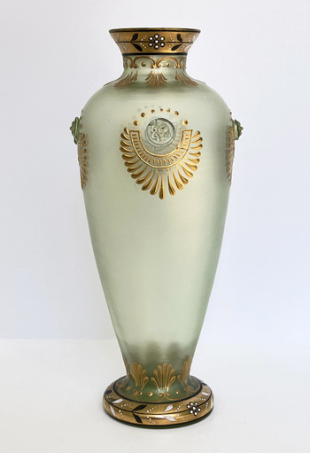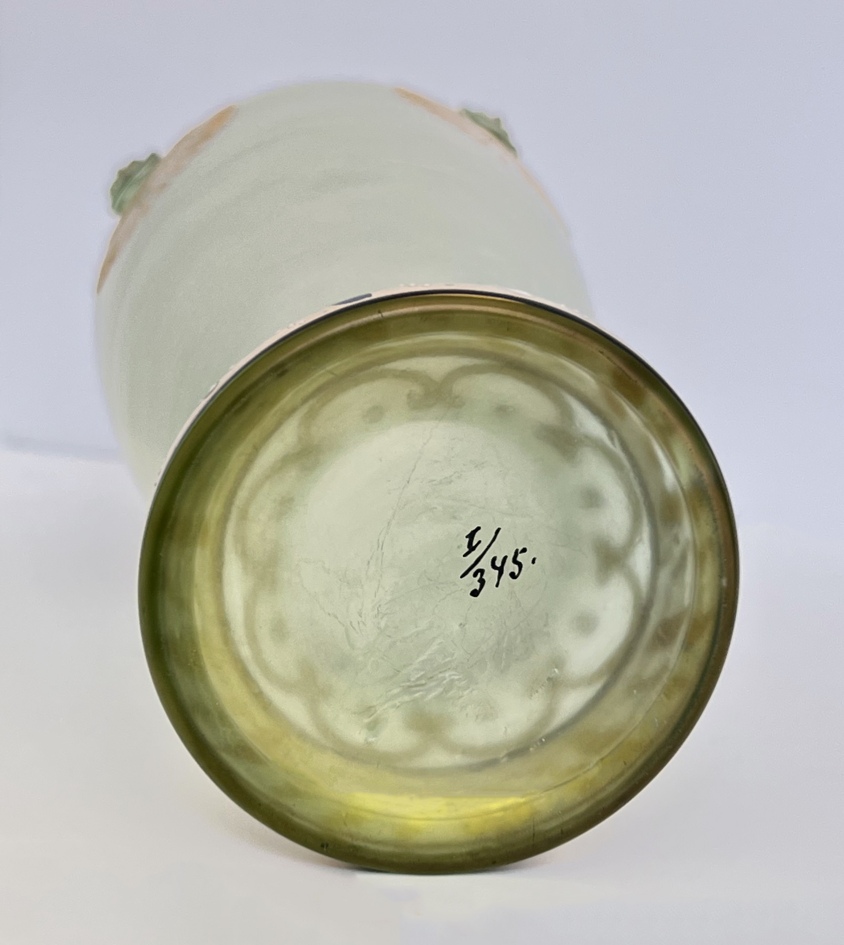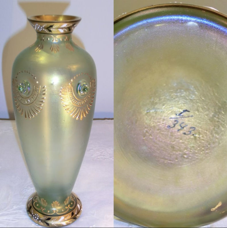 I wanted to share a Loetz vase that recently arrived; it was one of a pair, and both are marked with the DEK of I/345. It stands 9-1/2" (24.2cm) tall and is in lovely condition. Oddly, a vase of the same shape and enameling is shown on Loetz.com with the DEK I/343 on the base. I am not sure if this was a mistake made during the numbering of the piece or not, but it does add some confusion to these DEK numbers. (The third photo is from Loetz.com)