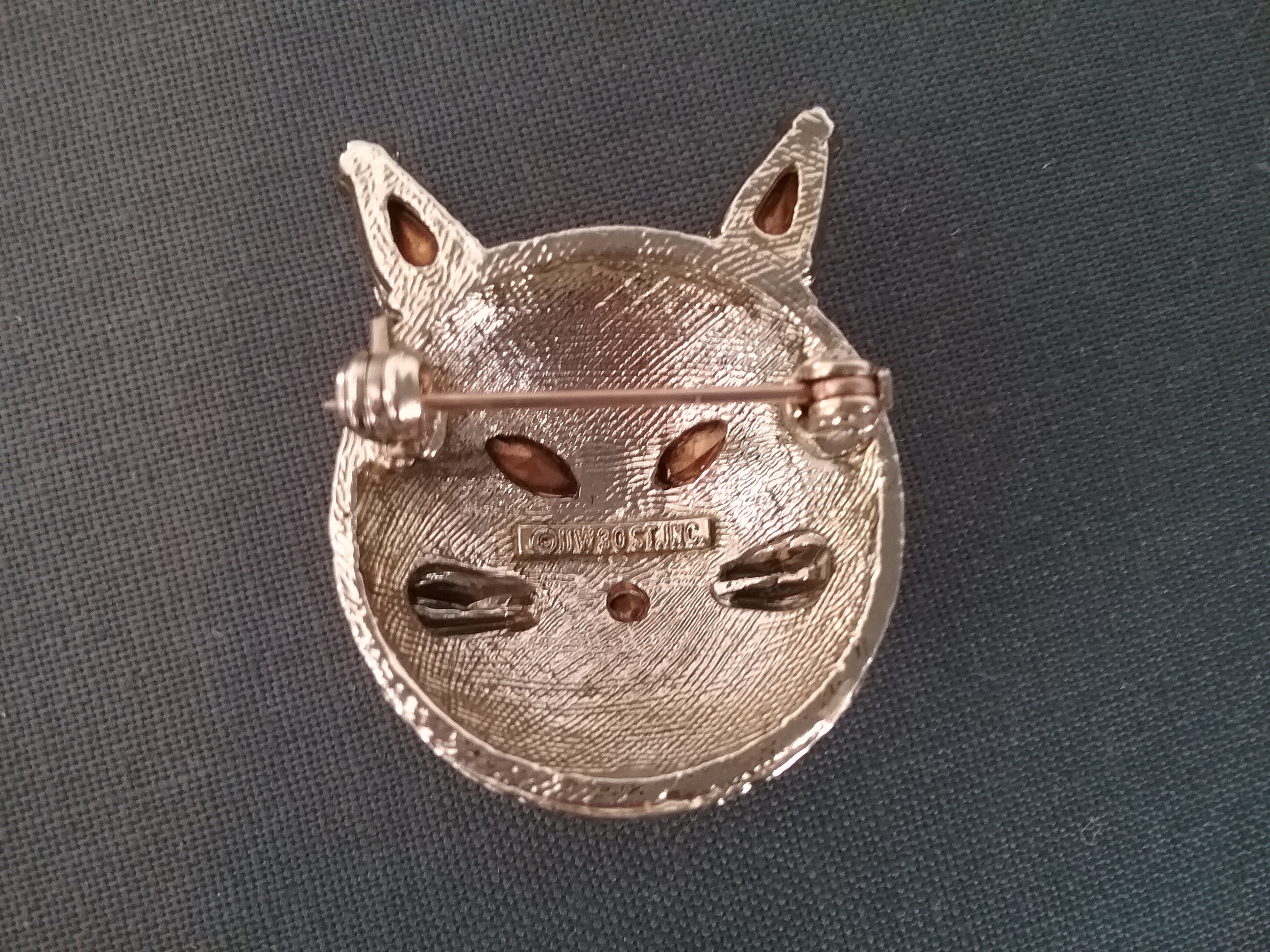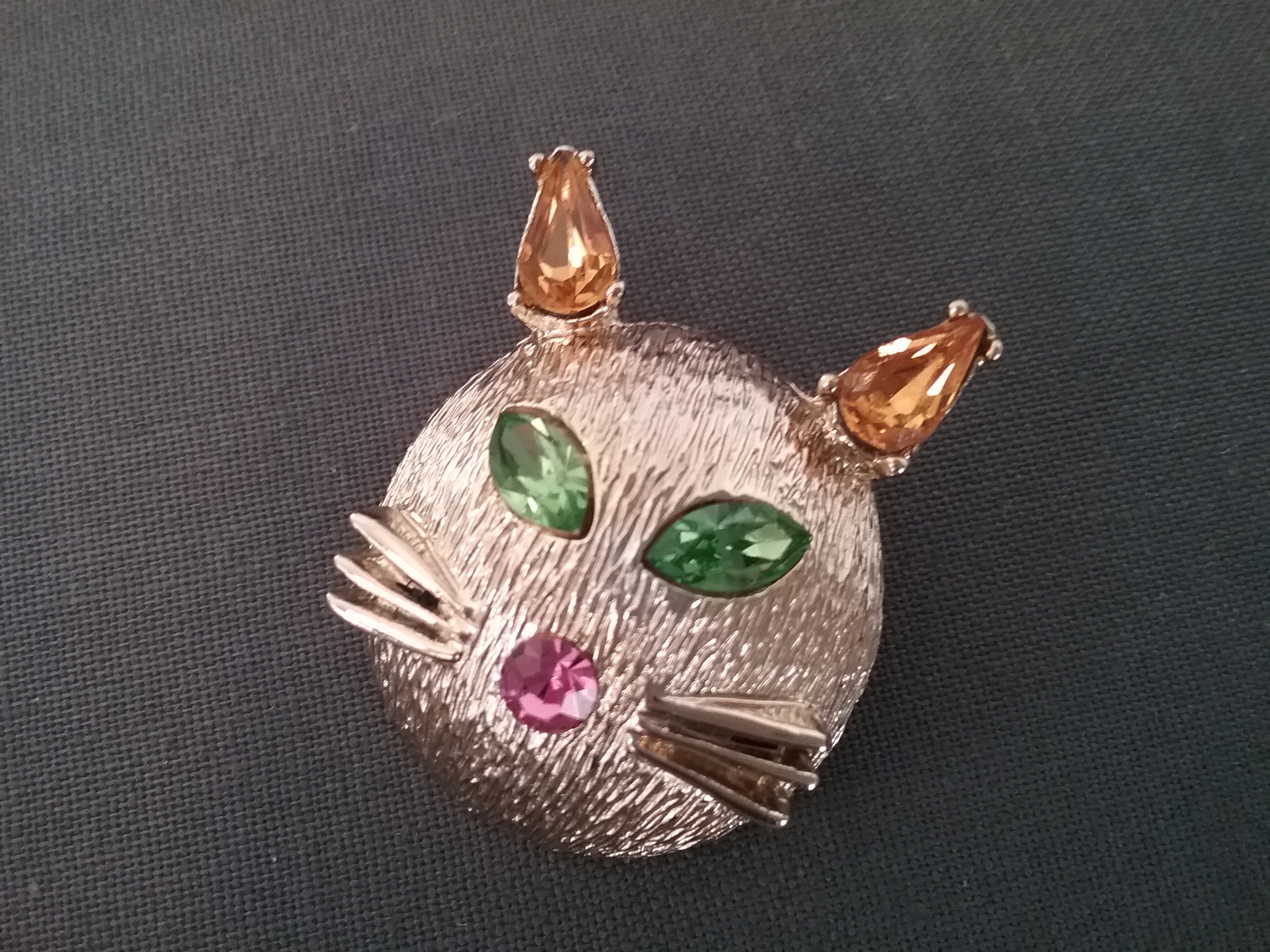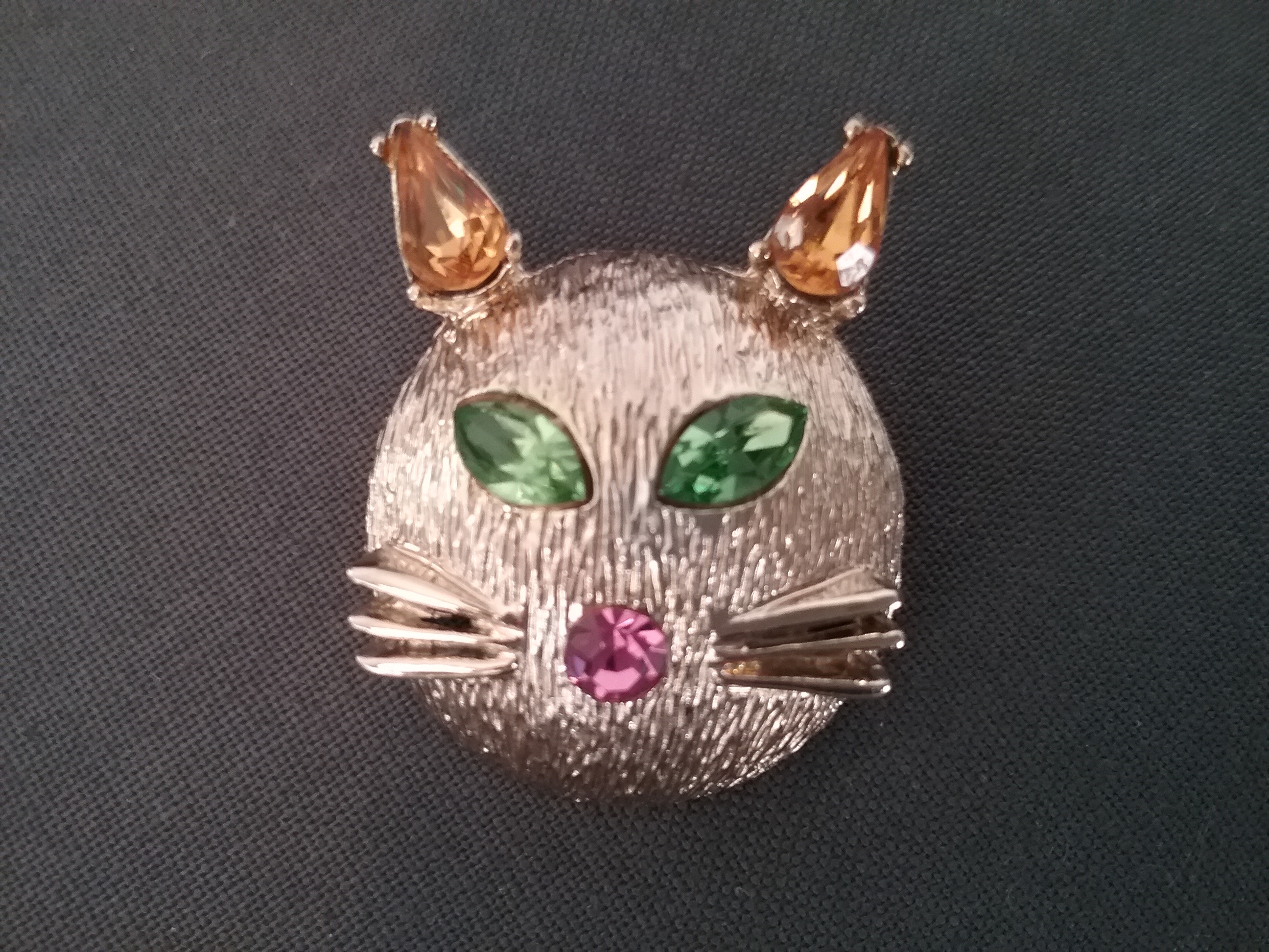 This 1 3-4" goldtone brooch has a cat face with whiskers, two green marquise rhinestone eyes, two amber teardrop stone ears and a round pink nose. By Dodds with their 11 W 30 St New York address mark on the back ca 1960s