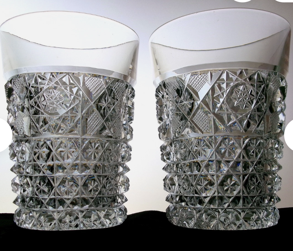 These are 4" tall and were produced by the Sterling Cut Glass Company. The design is called "Arcadia." They date from the early 1900s. The blanks are beautiful and clear and sharp to the feel which is a sign of wood wheel polished glass and not dumped into an "acid bath" as much of the American Brilliant Cut Glass you find today was. All of the cut glass made was not created equal.