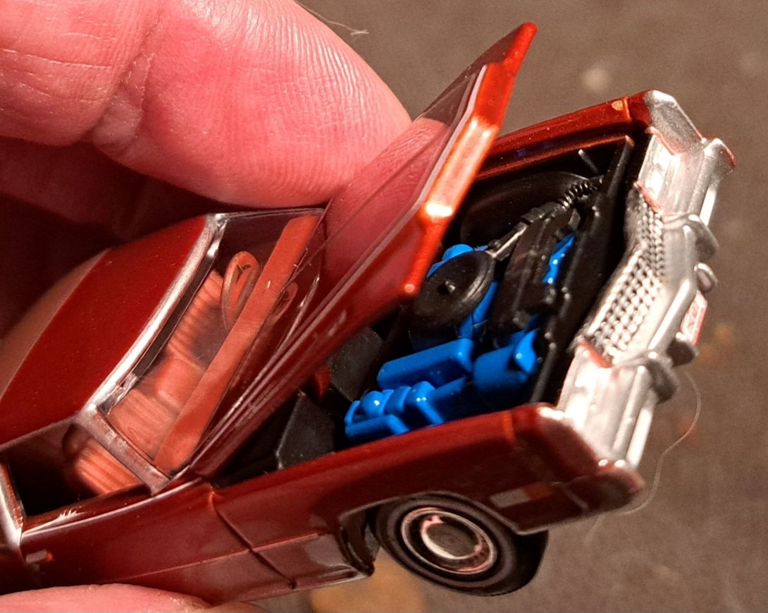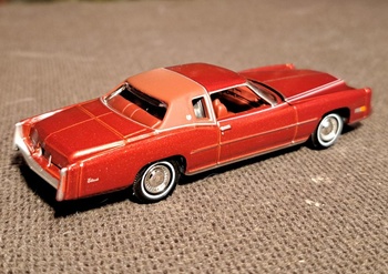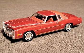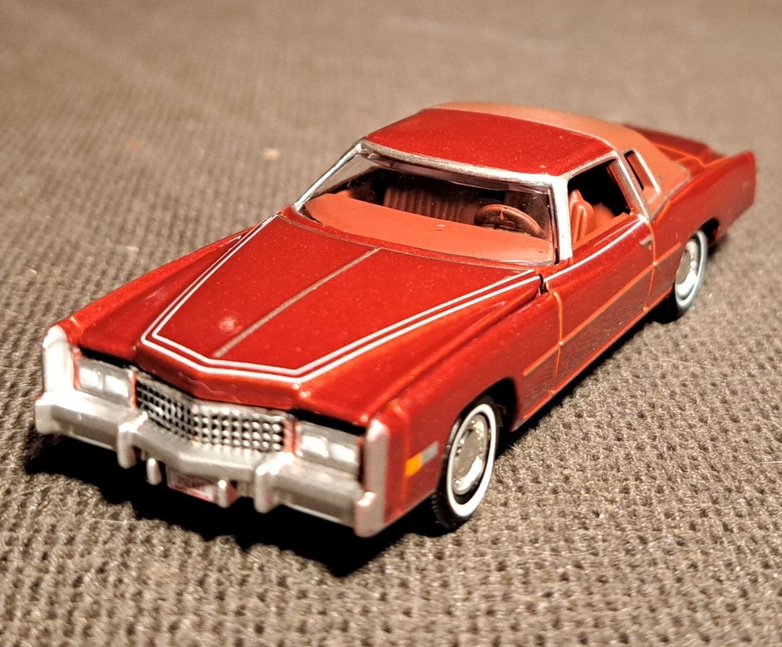 Got my phone fixed so I can post again. Starting off this tru 1/64 scale model. This is of course a 1975 Cadillac Eldorado. This was a 2 door despite the large size. Now even compact cars have 4 doors. It has a front end that is huge. Looks like it could fit a V12 but of course has a V8. It also has a Landau top befitting such a luxury car.