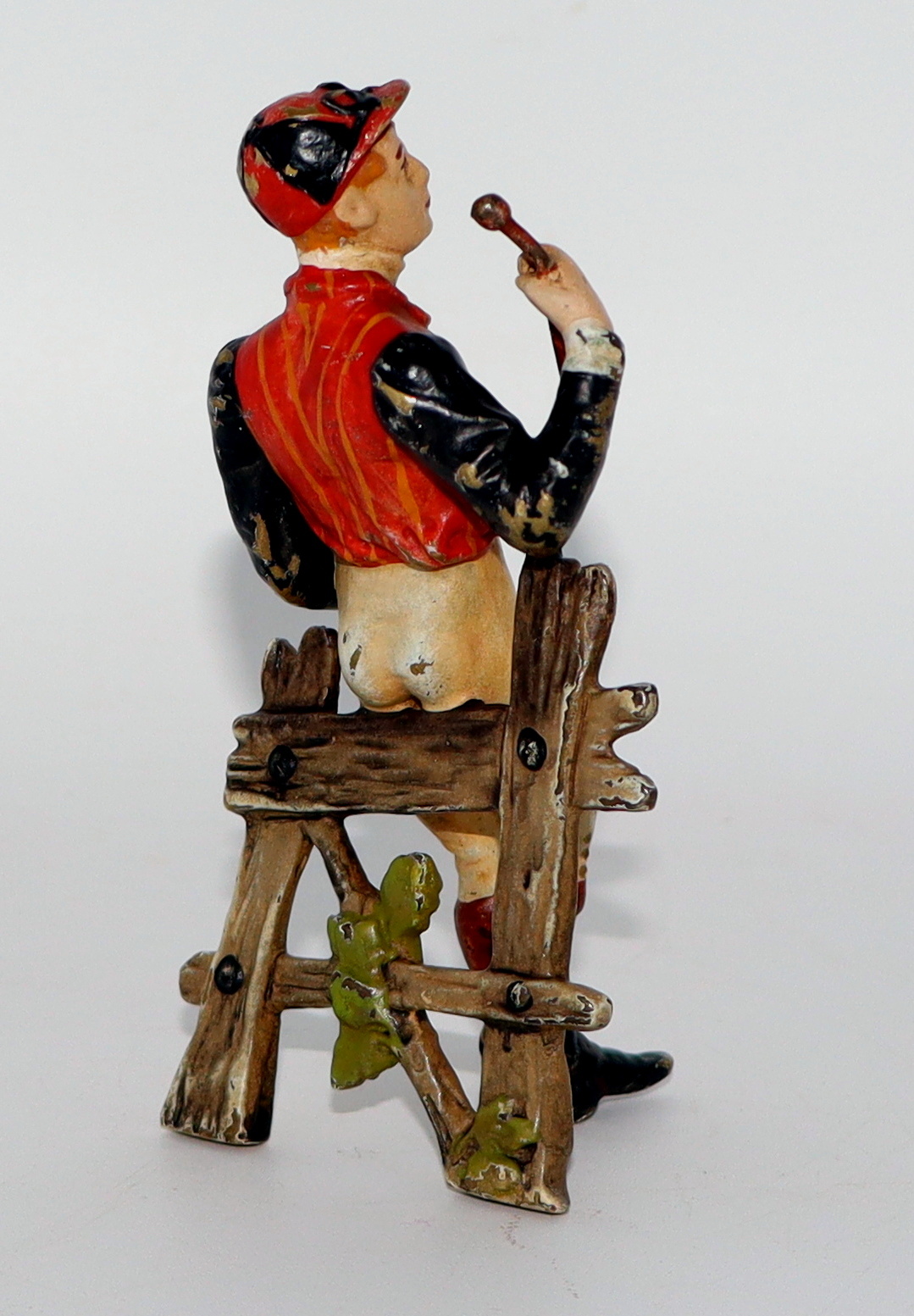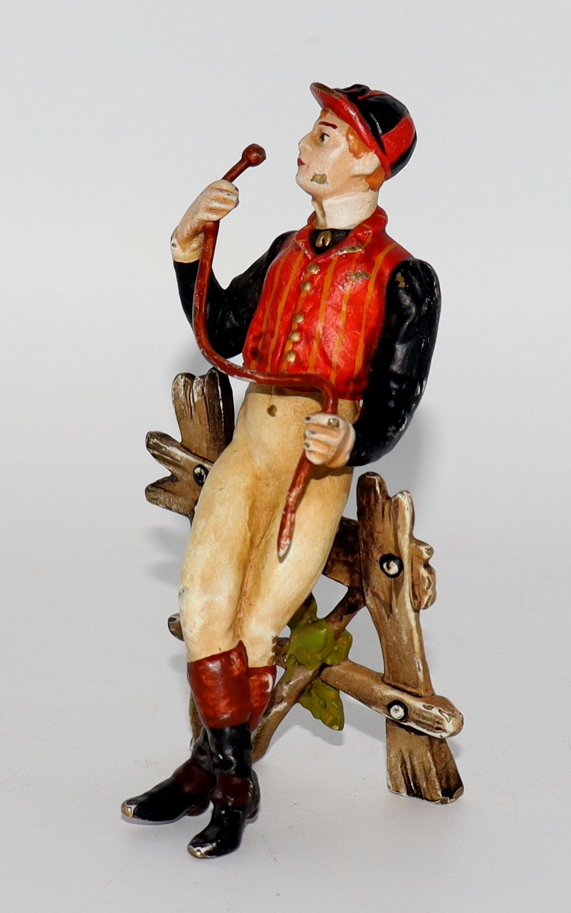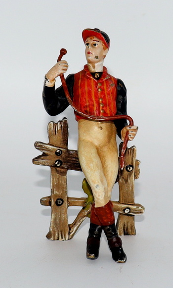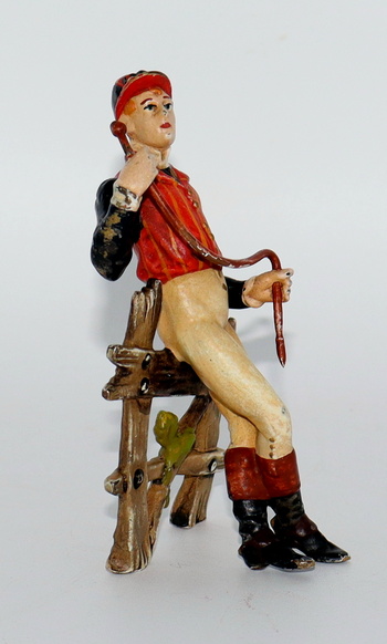 After posting the jockey bookends I was reminded of this little cold painted bronze jockey. He's French and was made in the late 19th century. He's holding his crop and leaning against a fence awaiting his horse.