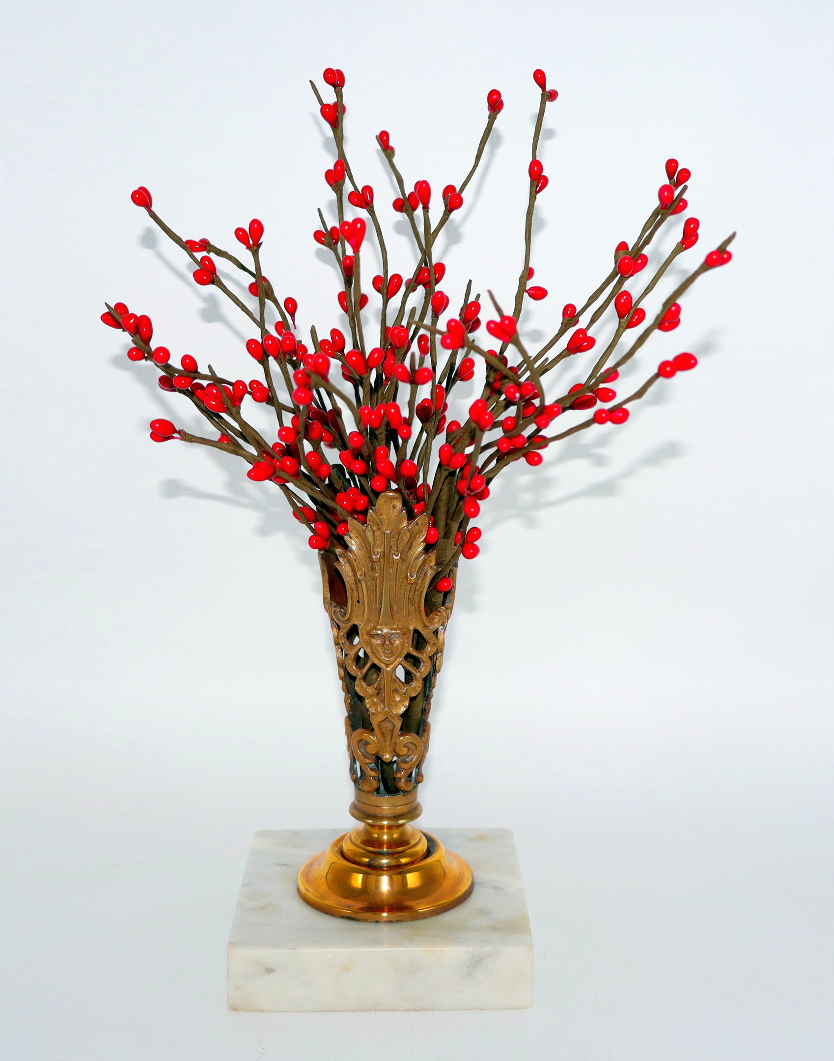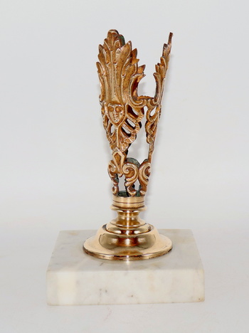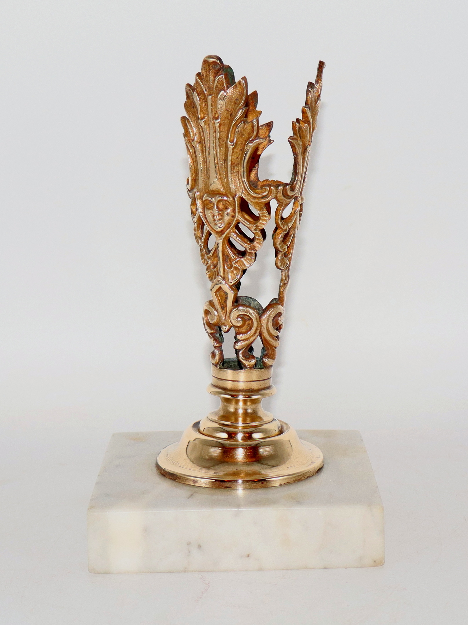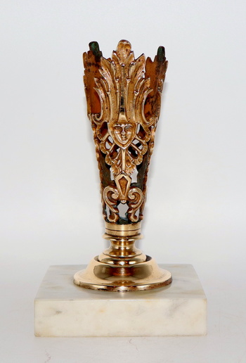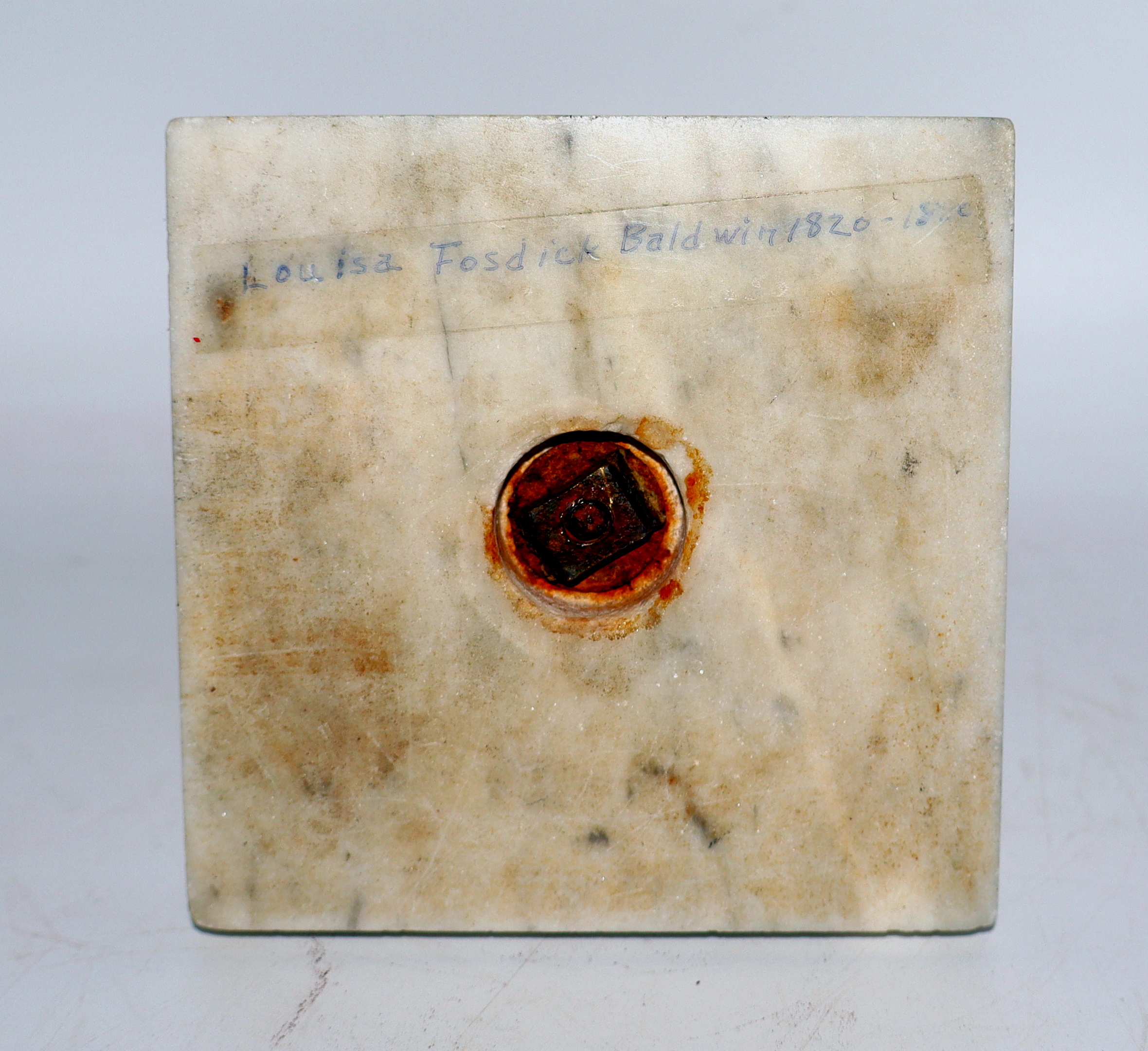 This one is a bit out of my collecting genre, but for the price I couldn't pass it by. It's a beautiful ornate brass vase mounted on a marble base. I don't like cleaning any piece such as this, but it was in very poor condition and I felt it necessary. It once belonged to a lady named Louisa Fordick Baldwin who lived between 1820 and 1880. So, that would make this vase at least 150 years old. It measures approximately 6 3/4" tall and the base measures 4" square.