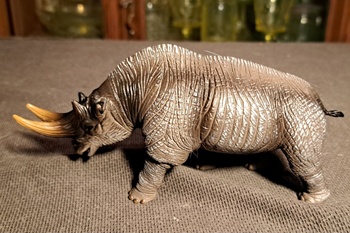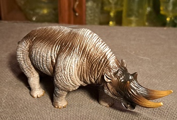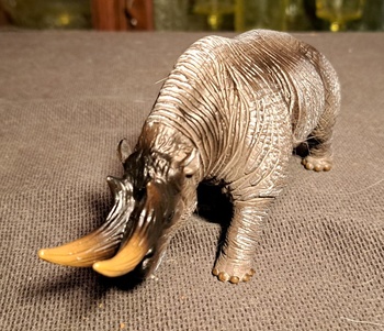 The arsinoitherium was a rather robust rhinocerous sized mammal from around 30 million years ago. It is a confusing animal due to some contradictory points. The horns are bone based like bulls or bison. They were built like a rhino but with a different The feet are like those of an elephant. In the end it was decided it was a type of elephant.