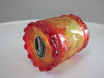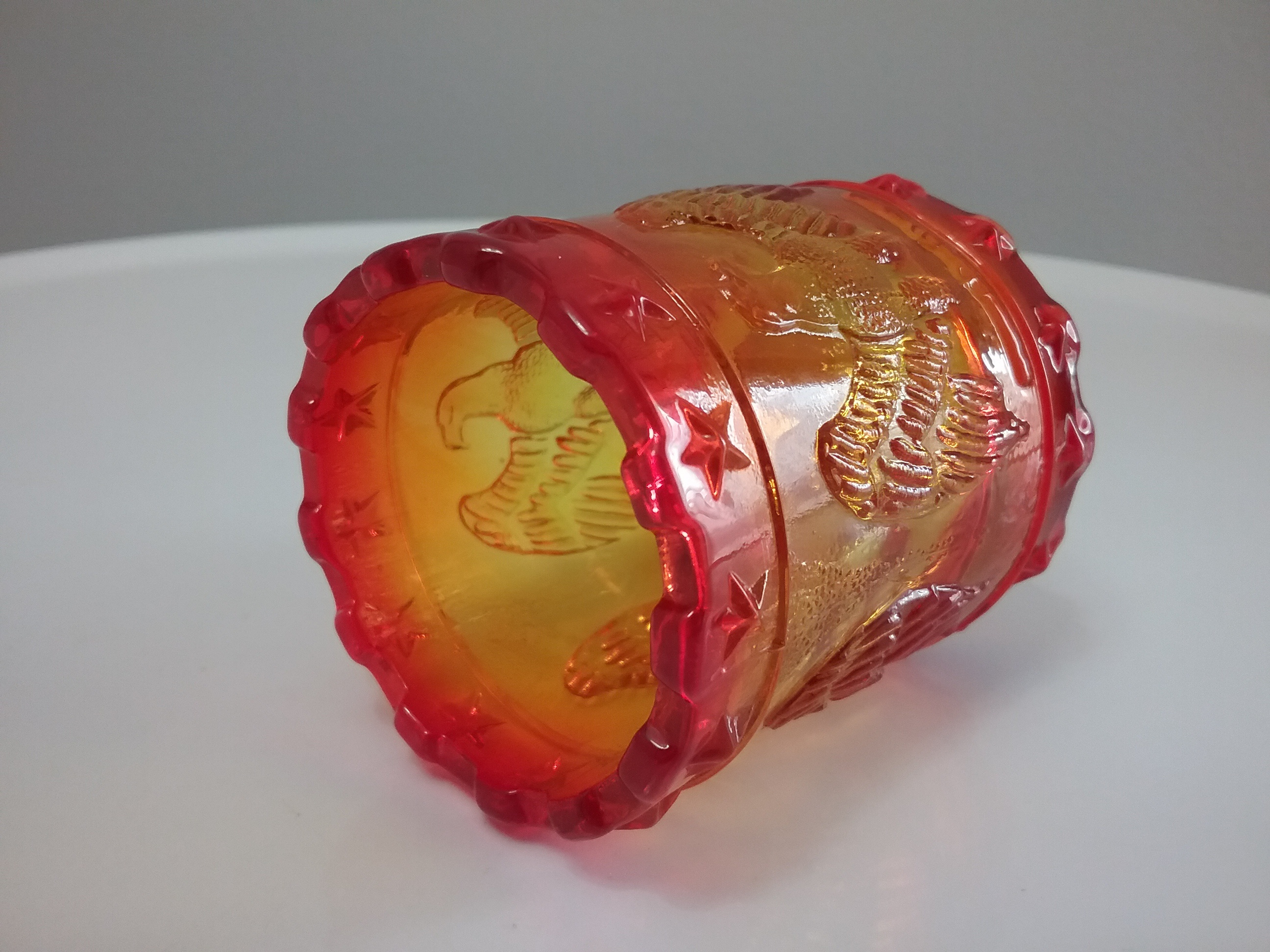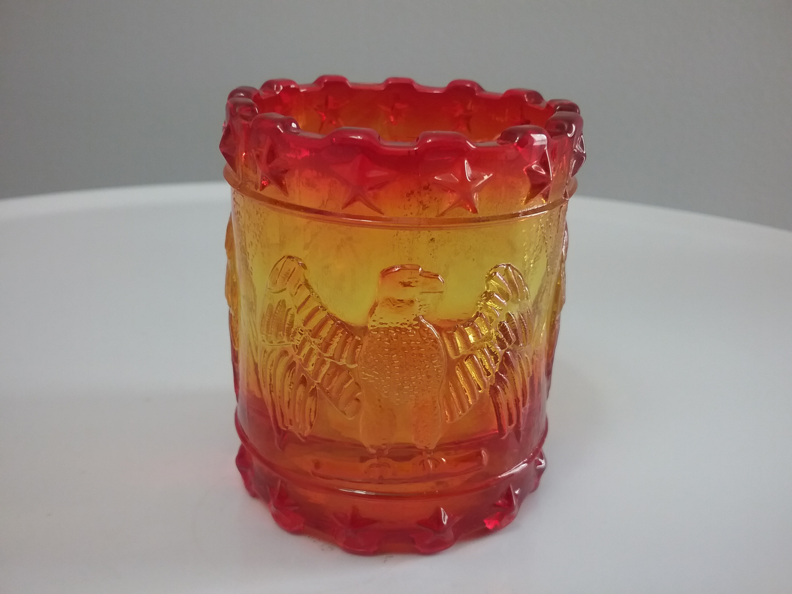 Here is a 2 3-4"H amberina glass toothpick holder with raised imprint of eagles surrounding the middle and raised stars around the rim & base. By Kanawha Glass of Dunbar WV ca mid-century, with orig label on the bottom