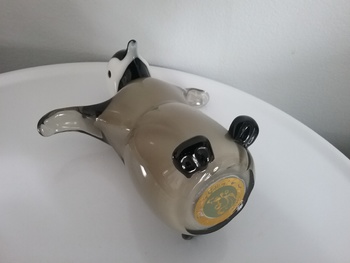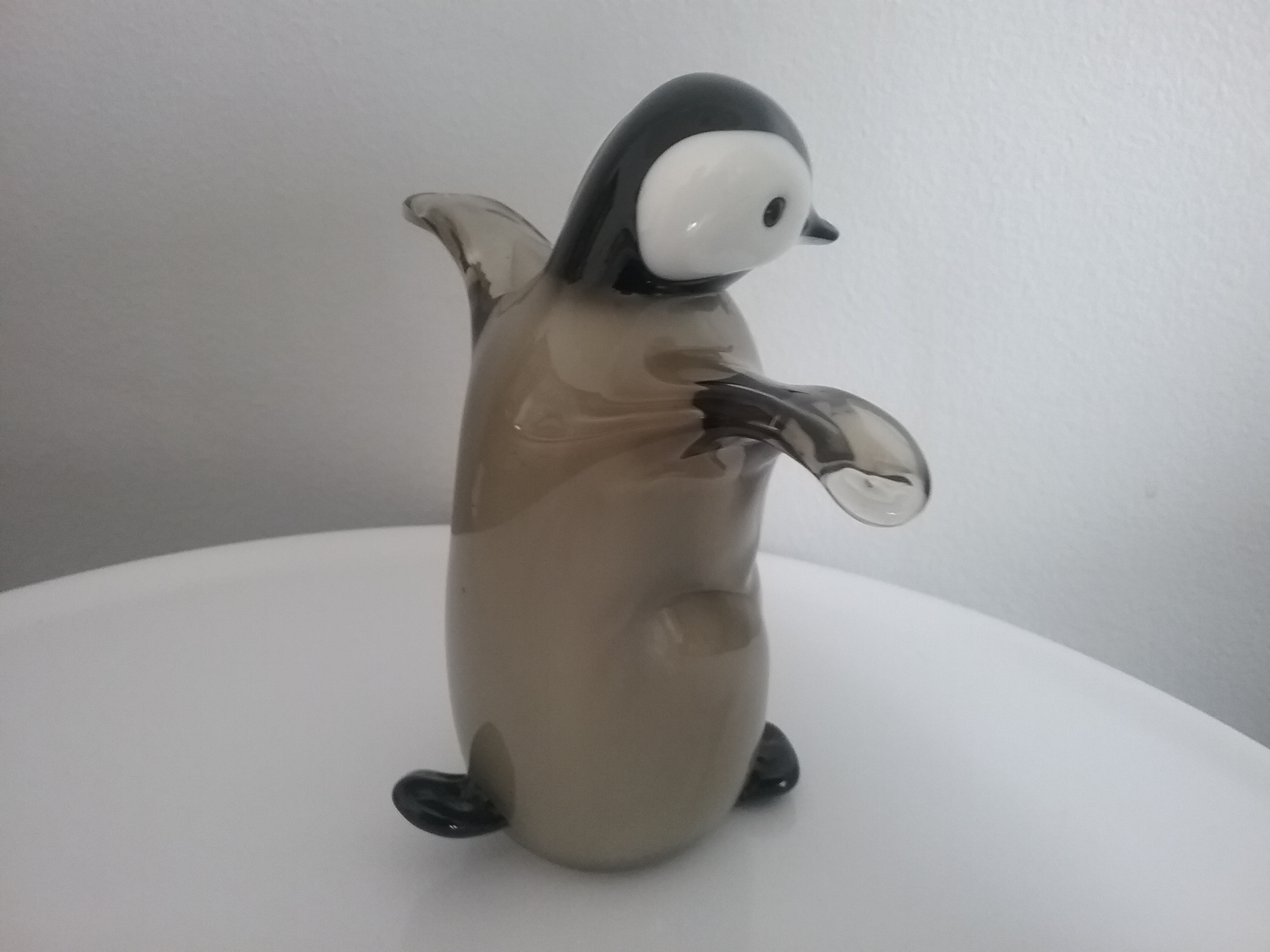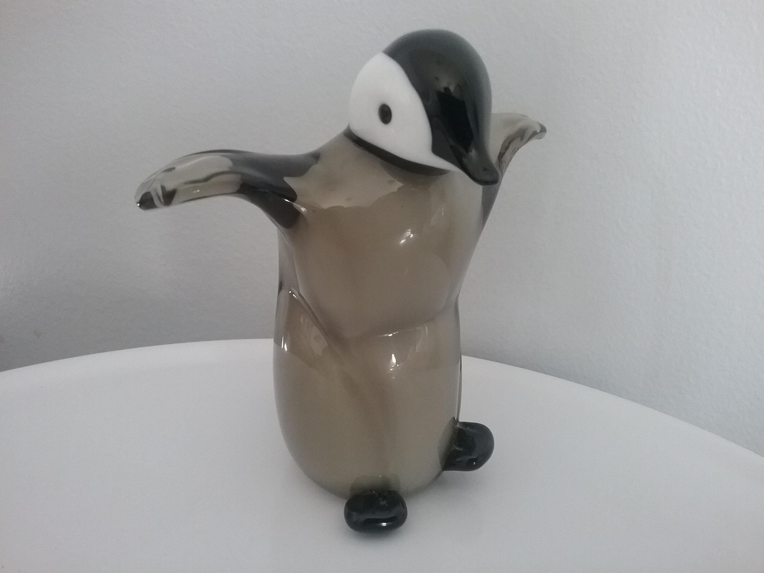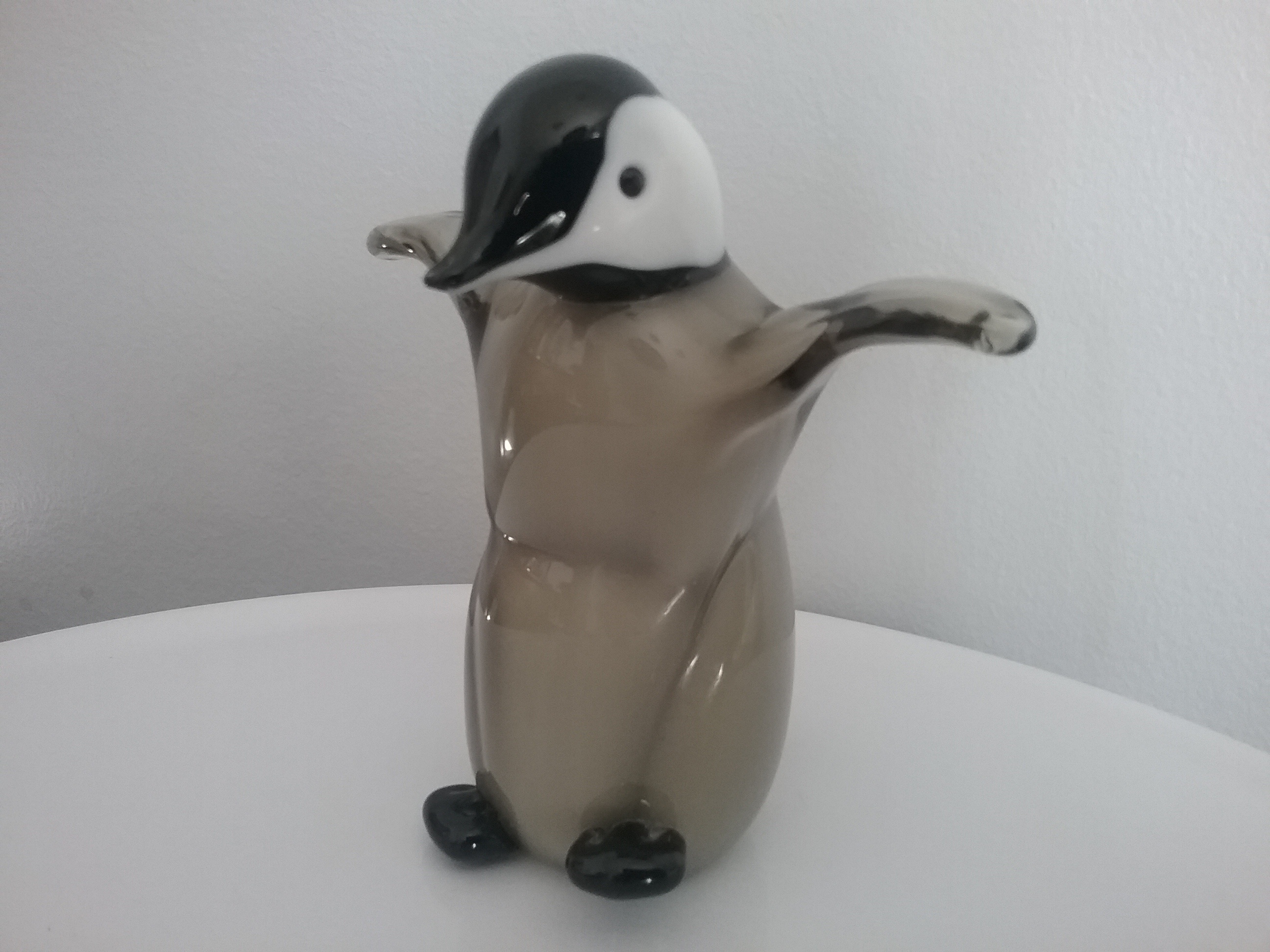 Here is a 5"H grey-brown, black & white glass emperor penguin chick with outstretched flippers and feet in uneven waddling gait pose, by Dynasty Gallery Glass of San Francisco CA with orig label