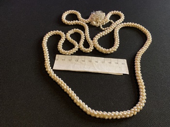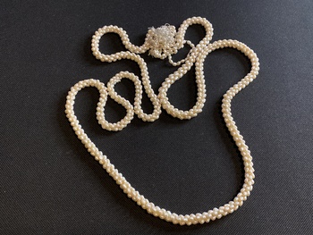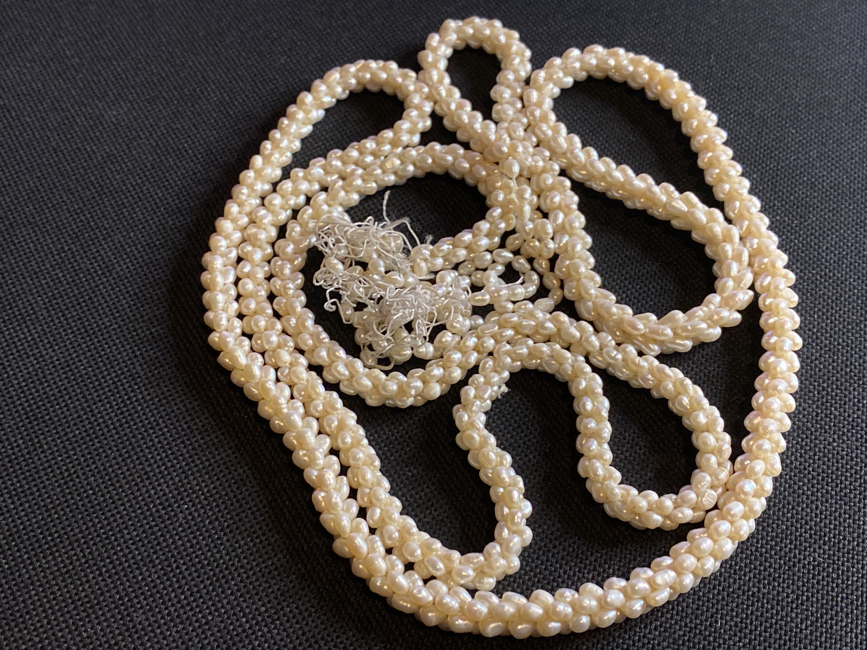 Hello I’ve just rediscovered a box of stuff I found when I first started looking for interesting antiques or vintage stuff. This I think might be Art Deco, maybe even older, it’s started to unravel, looks like plated seed pearls, would look amazing if fixed and on the right person.