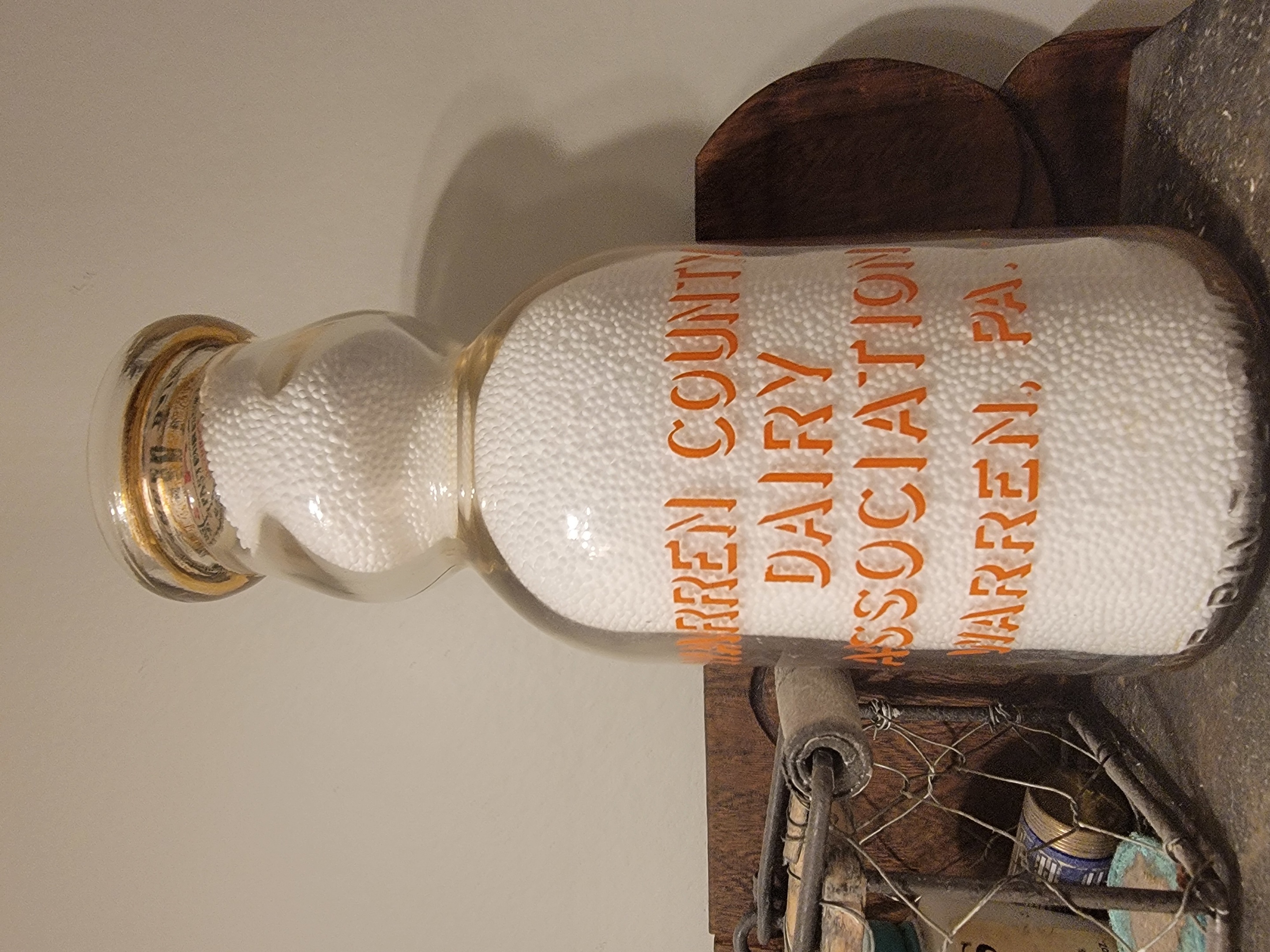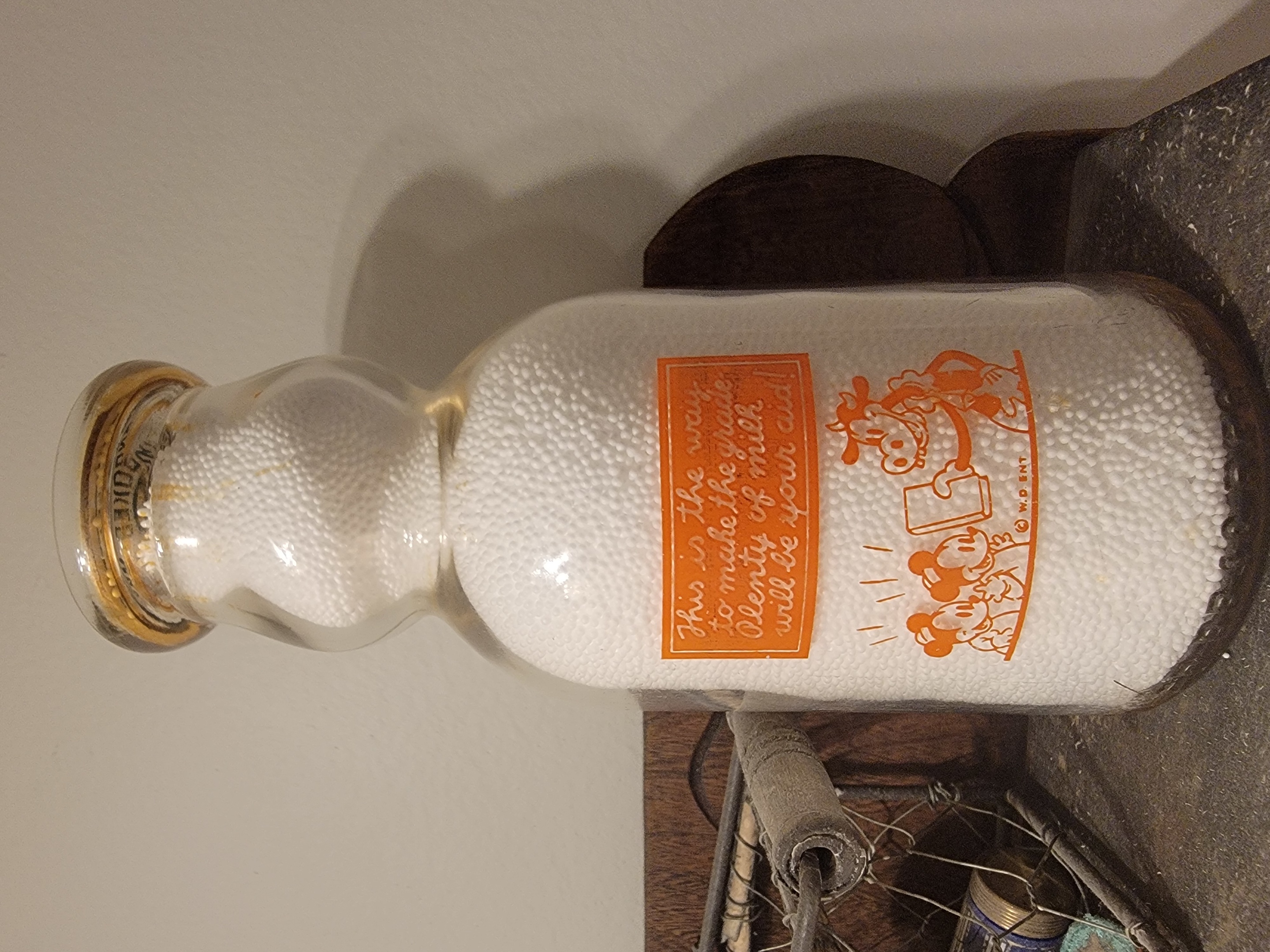 Pictured here is an early orange pyro pint cream top milk bottle from WARREN COUNTY DAIRY ASSOCIATION..WARREN PENNSYLVANIA. The back side features a Disney design with Clarabell & the two little mice. THIS IS THE WAY TO MAKE THE GRADE--PLENTY OF MILK WILL BE YOUR AID.