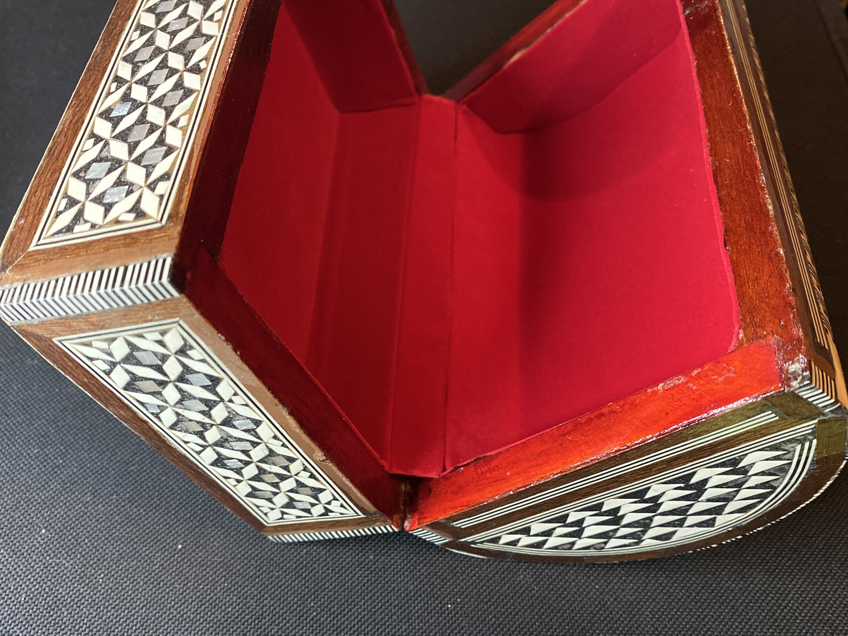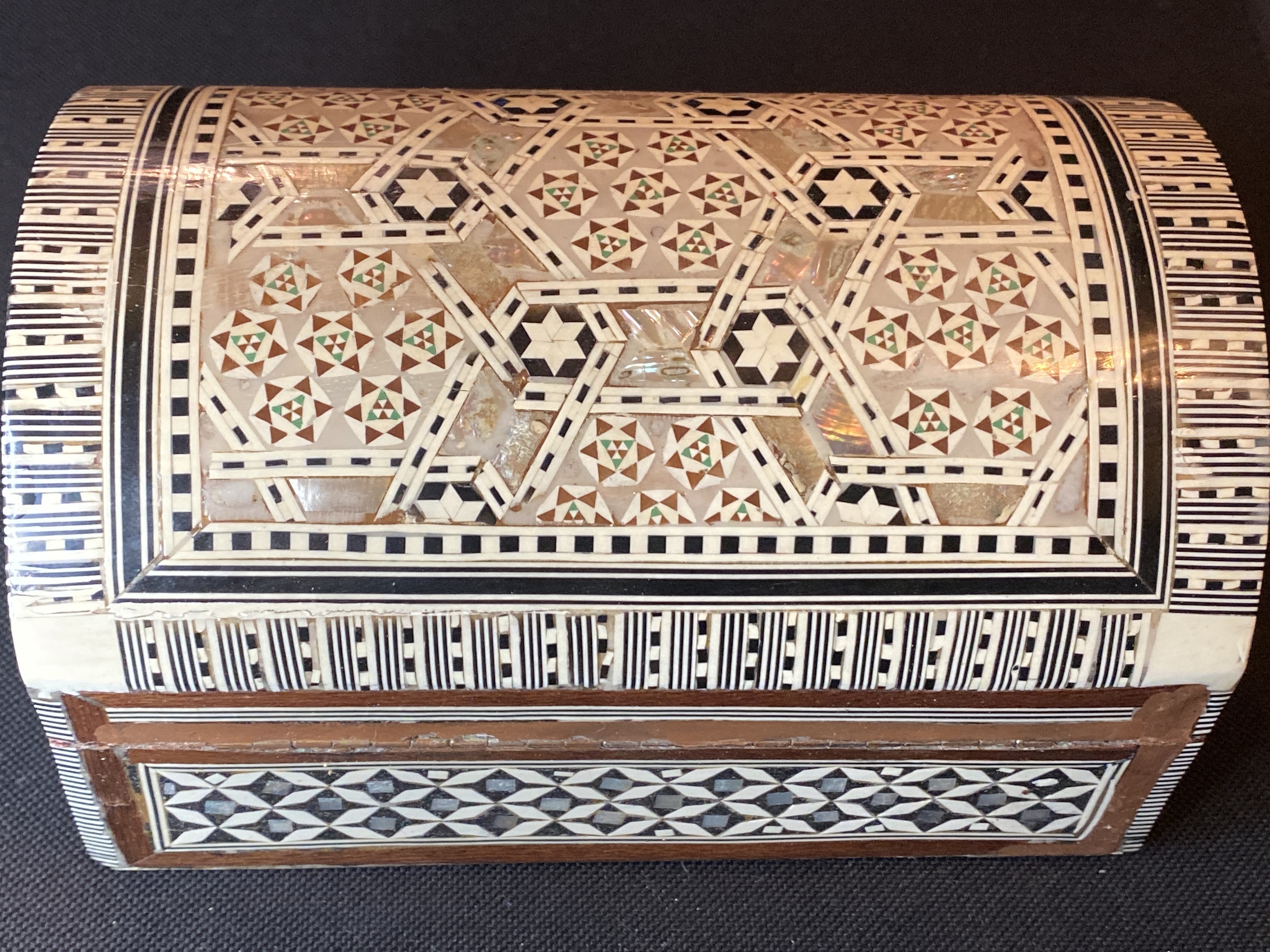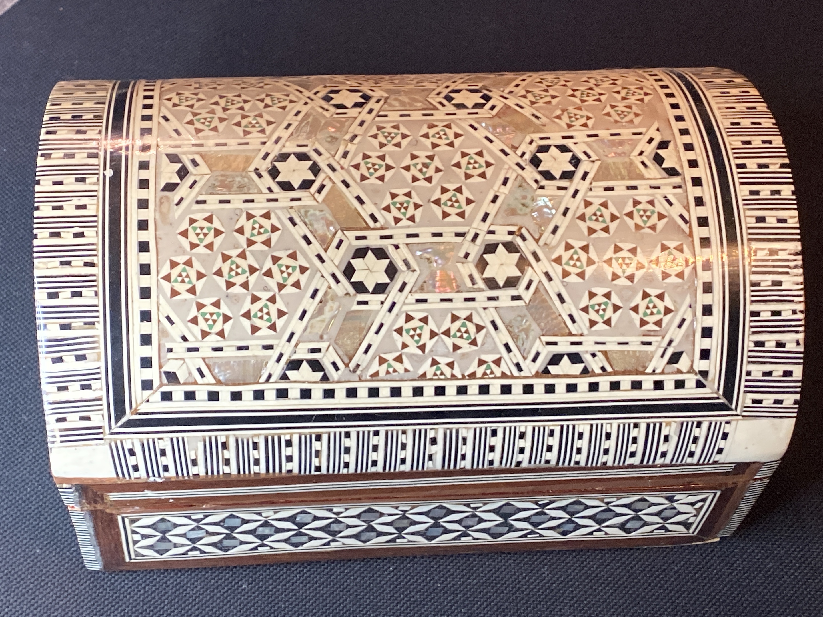 Hello I’ve just rediscovered this lovely Syrian casket, it’s quite big & guessing a jewellery box. A early find from over 10 years ago, no idea how old it is. This needs a home as shouldn’t be boxed up. Looks used as I can see some of the little tiles are missing and can see signs of age.
