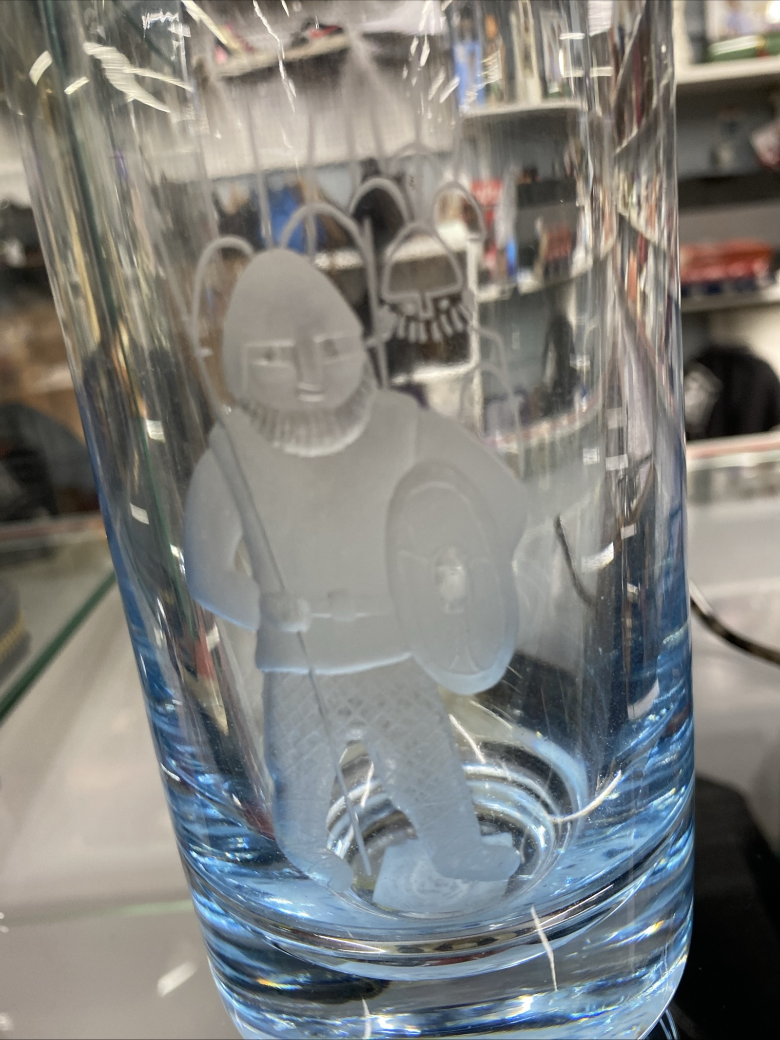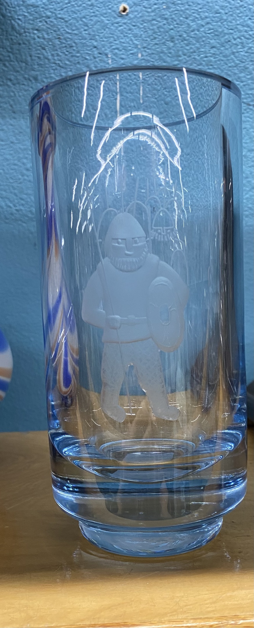 I have this ice blue wheel etched vase that I have researched extensively. When I bought it I thought the signature read Strombergshyttan but have since found that to be a stretch. I believe the figure in the etching is a Viking but that search led nowhere. I bought it because I love Scandinavian glass and the ice blue color. Does anyone have any clue or information? Any help would be much appreciated.