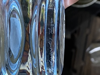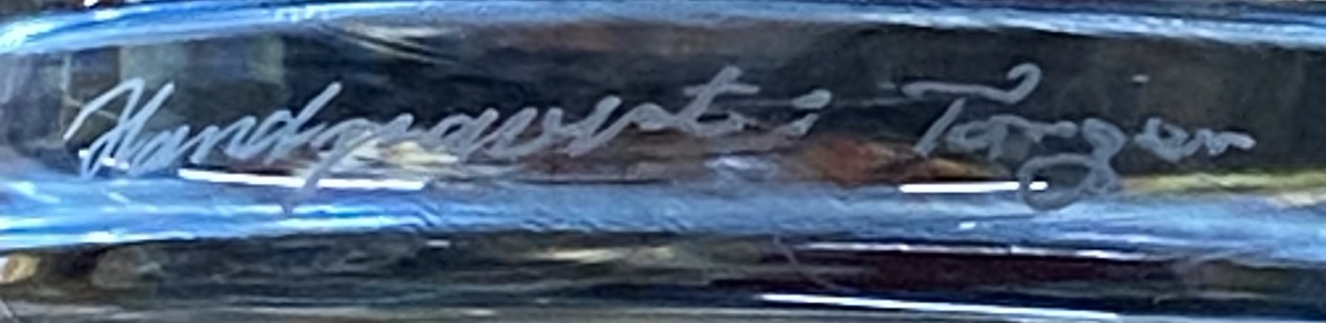 "The image displays a signature, likely etched into a glass object, which appears to read "Handgravyr: Torgny". This translates from Swedish to "Hand engraving: Torgny".