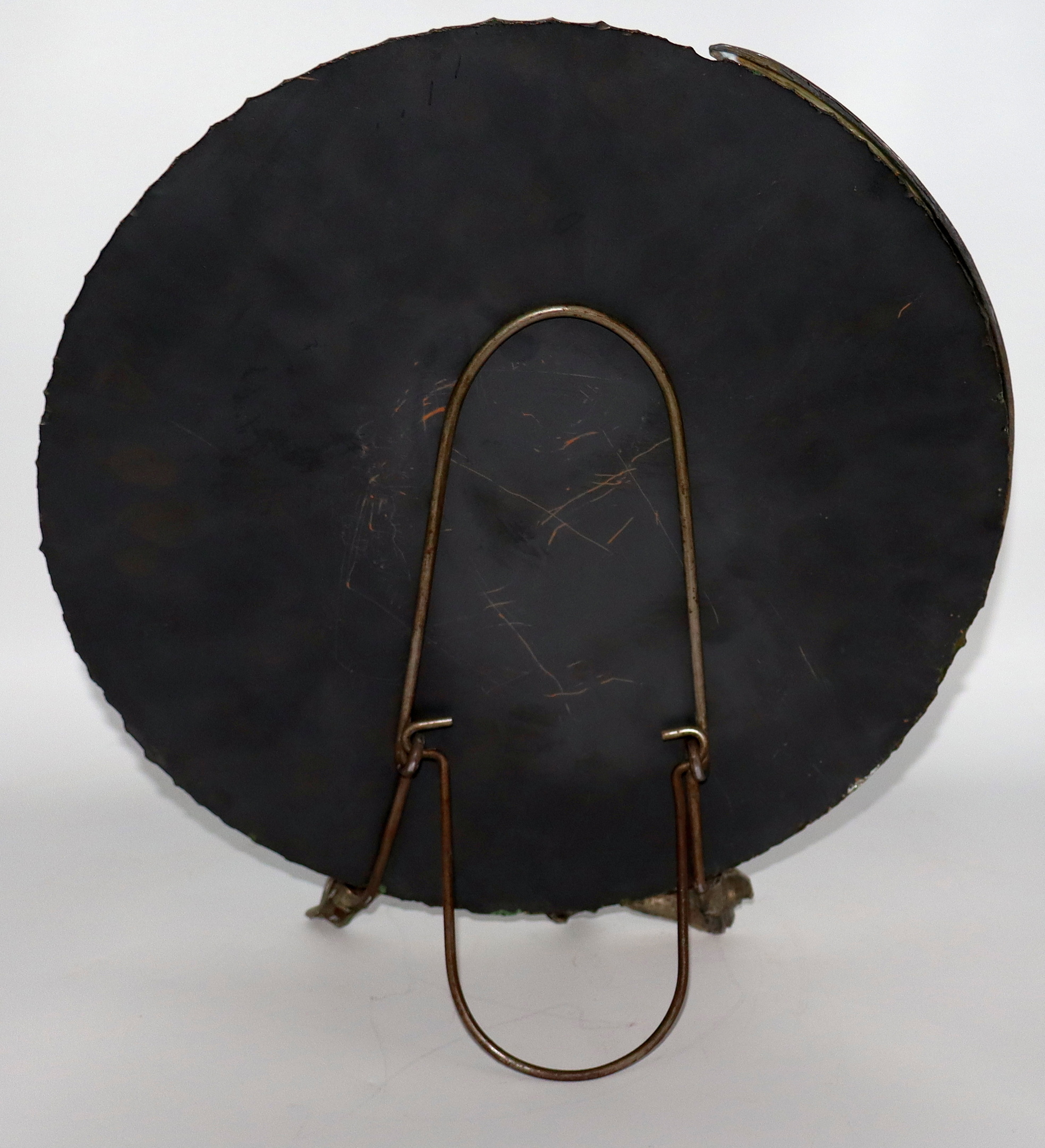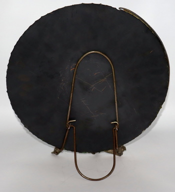 I love the scalloped edge mirror and the larger design. The mirror alone is very thick glass and quite heavy I must say. There is a very small area on the backside of the mirror holder and the material underneath is bronze. The characters on this larger version are much more defined than the smaller version. The mirror measures 12" in diameter and the entire piece measures 12 3/4" tall. I have another that I'll post later.