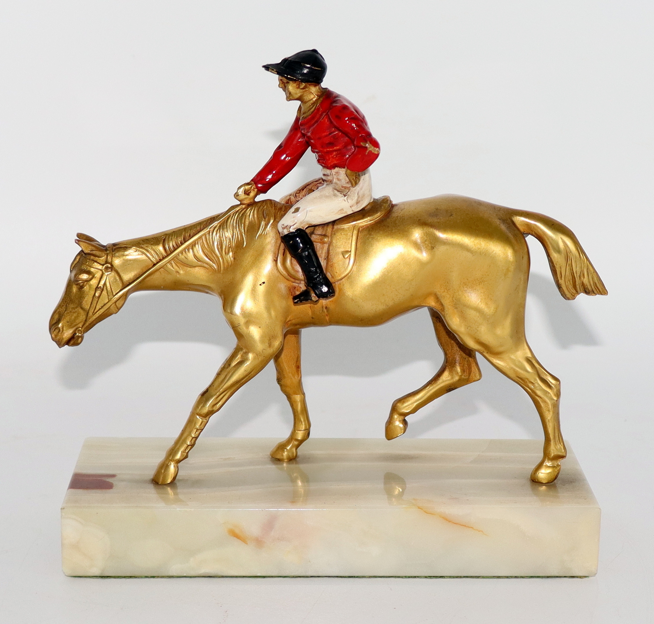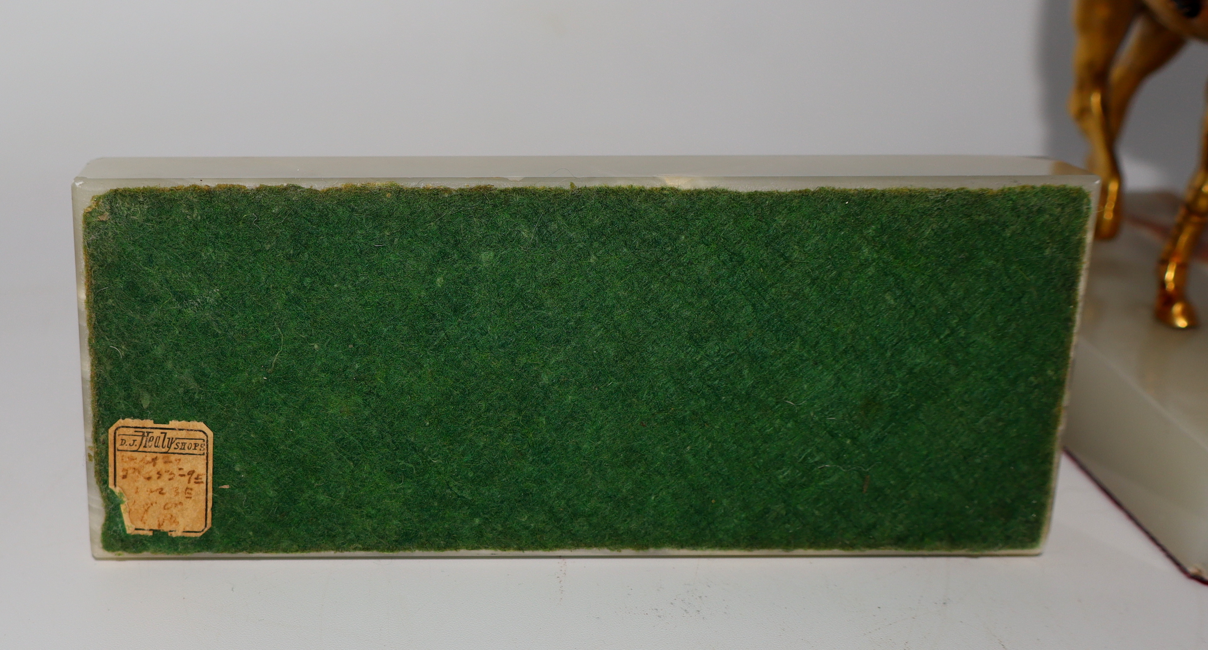 So, you probably saw my post of a Mid-Century Horse And Jockey a few days ago. I was able to find a match to this one to complete my bookend set. It's identical to the previous one I posted. The only thing different from one another are the onyx bases. This one still has the D.J. Healy Shops sticker on the bottom. As with my other, this one also measures 5 3/4” long and 5 1/2” tall.