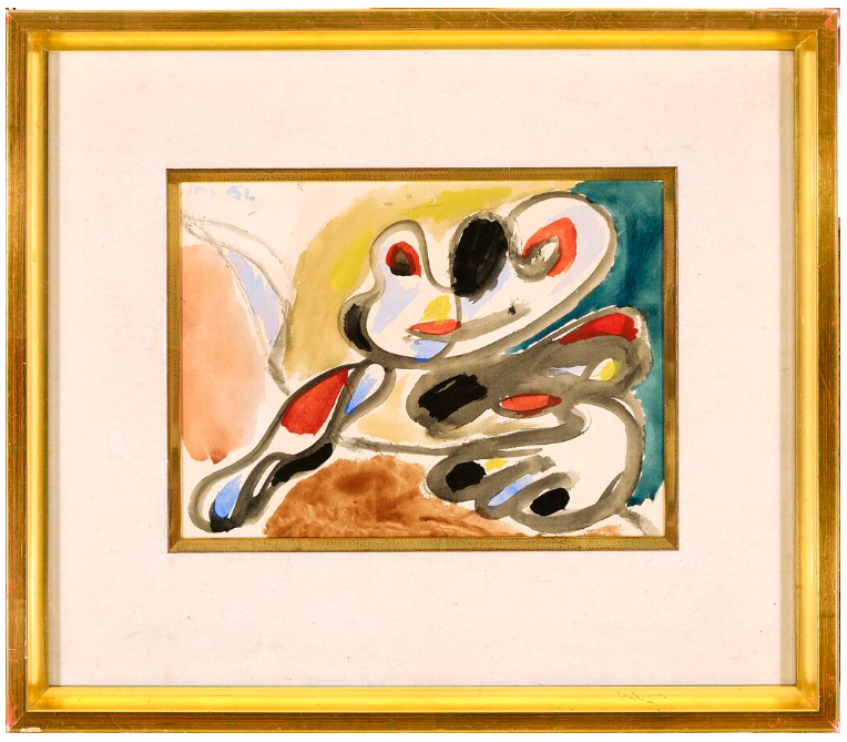 1951 was 'annus horribilis' for the Danish artist Asger Jorn, born Jørgensen (1914-1973). He was brought home sick from France with malnutrition and tuberculosis and admitted to a sanatorium. He gradually got better and an empty room, next to the one where they kept the dead bodies, was given to his disposal for work. Maybe it was there he painted this watercolor, 20 cm X 26 cm, signed Jorn 51, now in my collection. On the sec. photo you see him work, at a later year, on a wall decoration in Havana, Cuba.