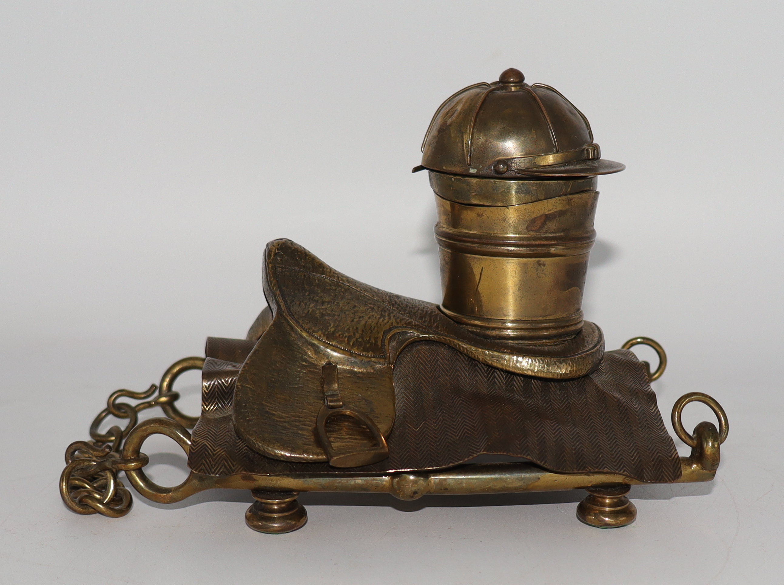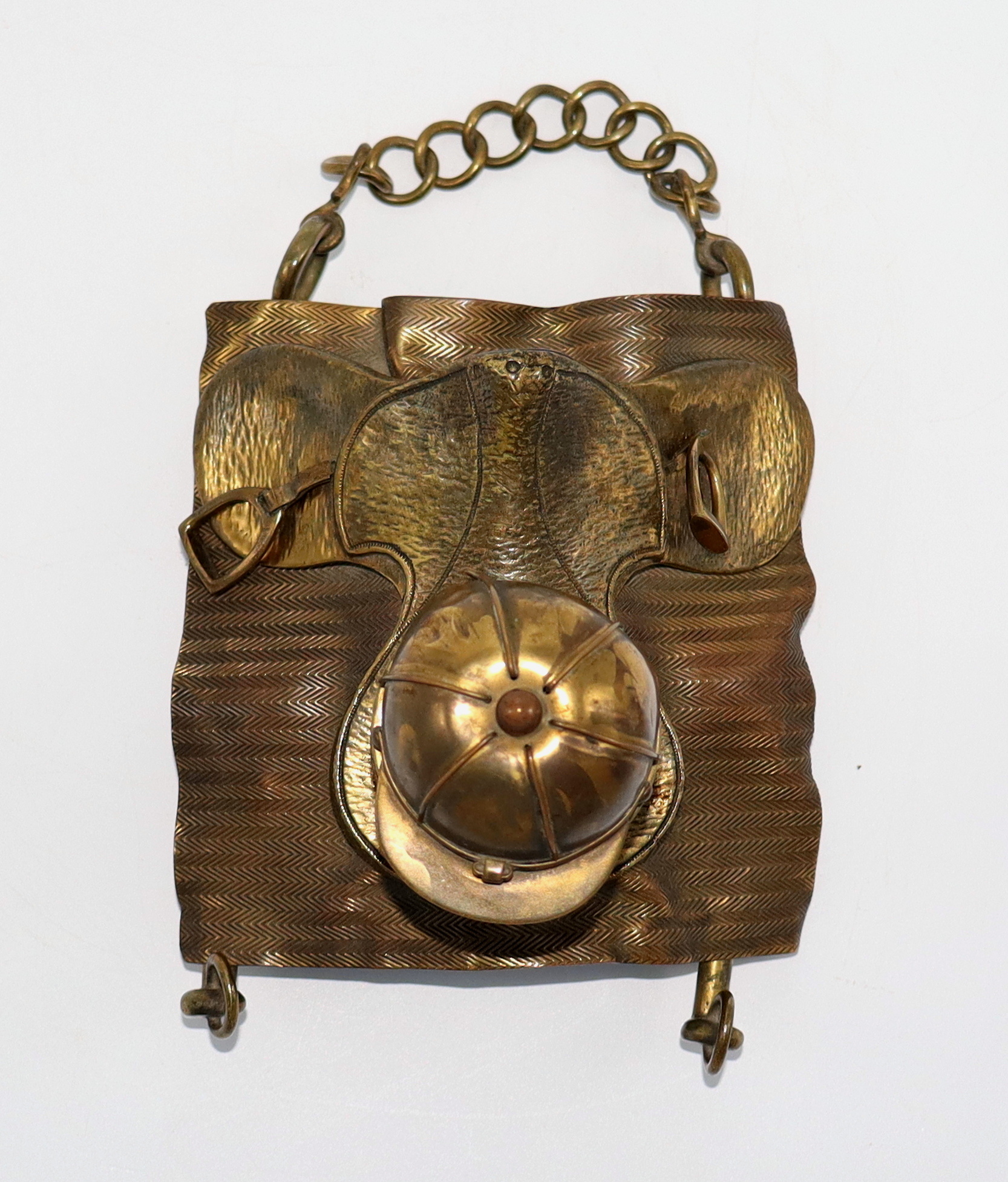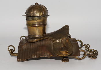 Another of my match holders I'd nearly forgotten about. This one depicts a jockey helmet, saddle and saddle blanket. The helmet opens to reveal the matches. It would have hung on a wall and the saddle blanket serves as the striker plate. It's made of brass and would date back to the 1930's-1940's. It measures approximately 5" long, 4" wide and 3" tall.