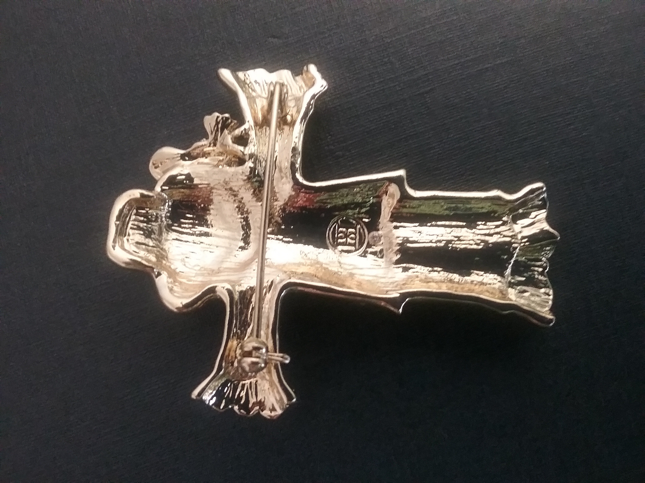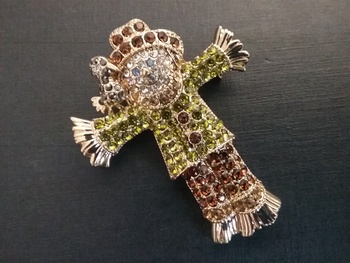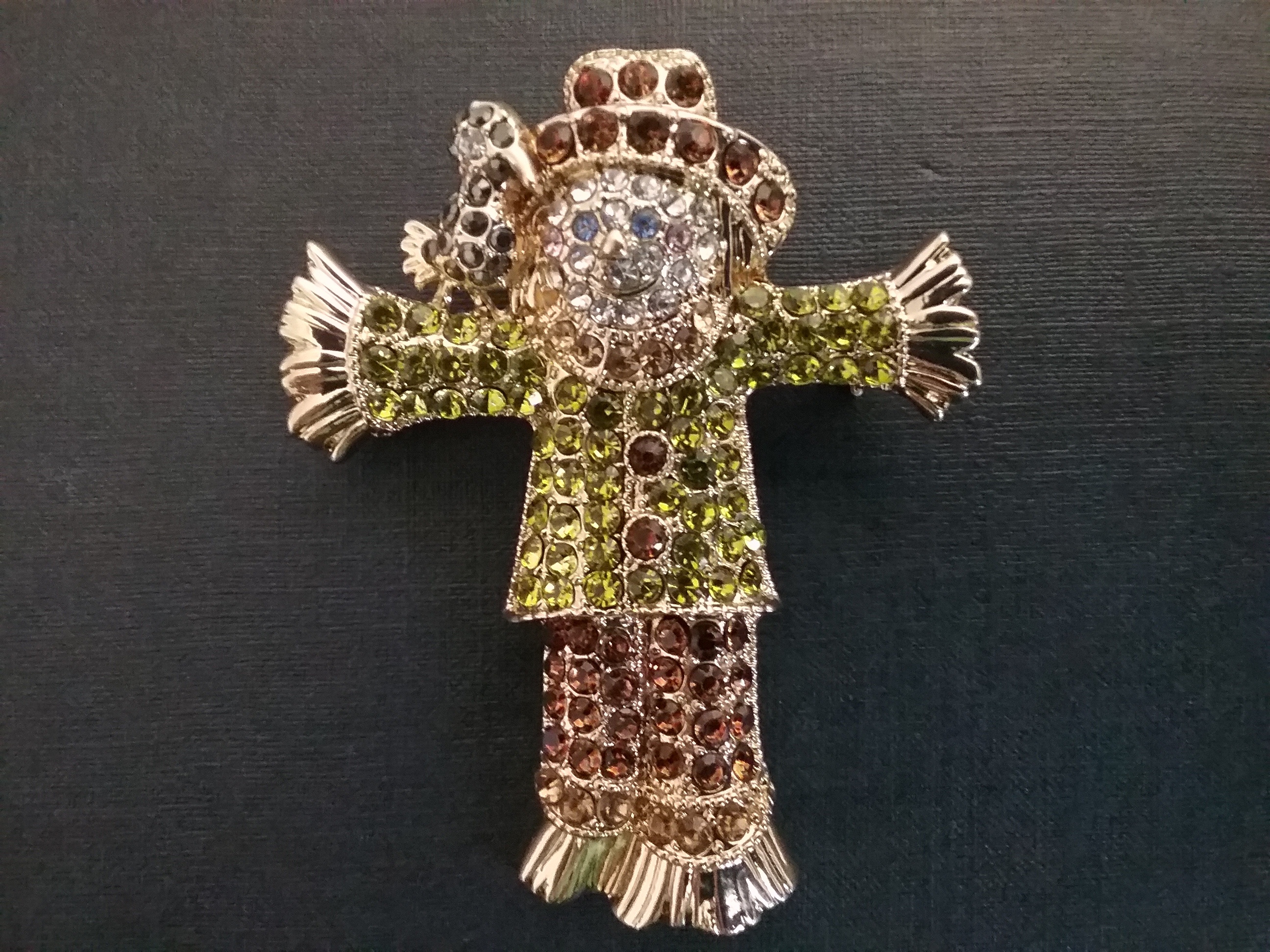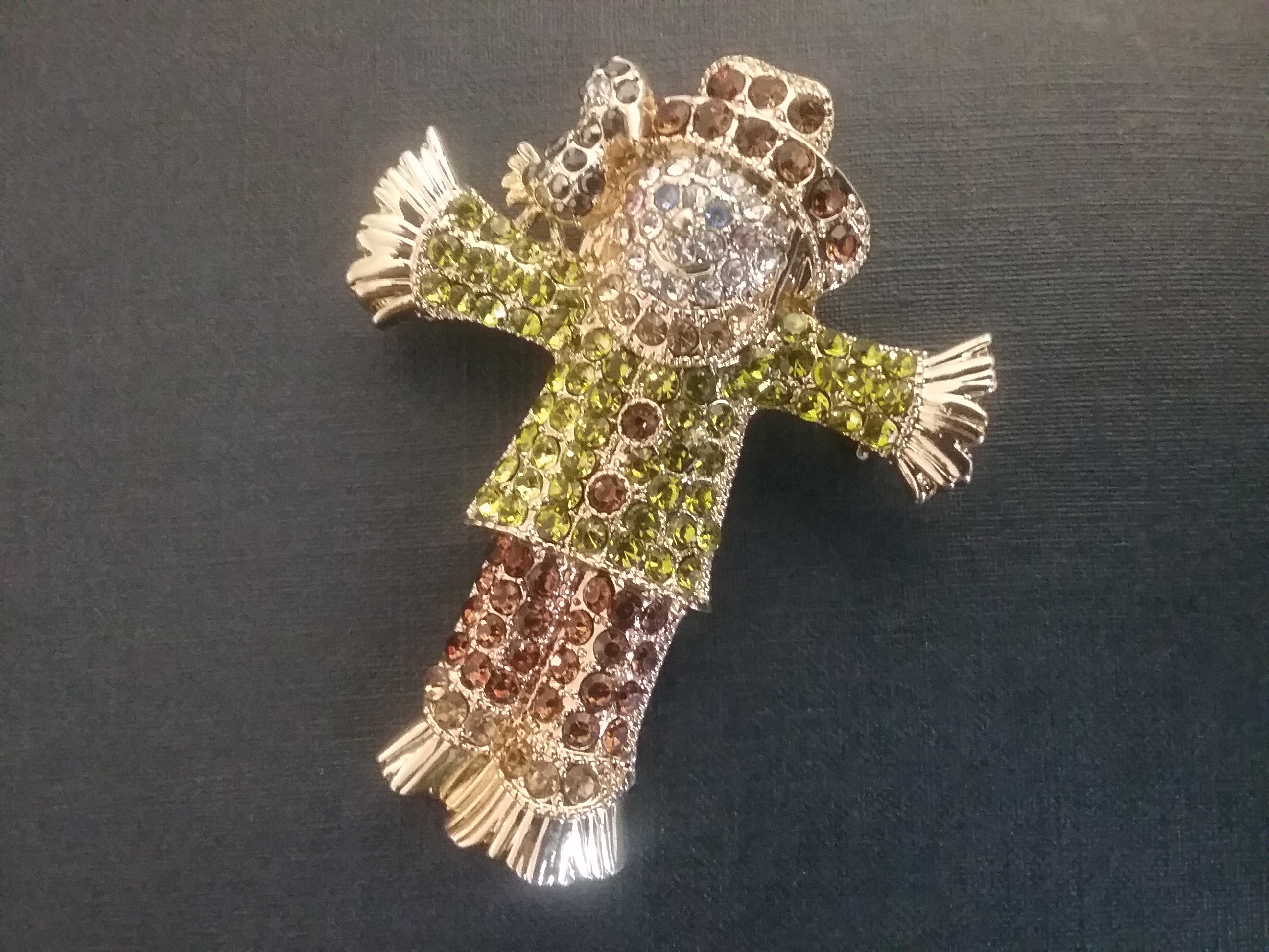 This 2 1-2"L goldtone scarecrow brooch has tiny lt green, brown & clear rhinestones, two blue eyes and a mini black crow on its shoulder. By Dana Buchman with stylized double B logo on the back