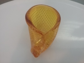Here is a 3 1-2"W yellow glass cornucopia which I've stuffed with some faux acorns & berries for the autumn season. From Murano Glass of Italy mid century