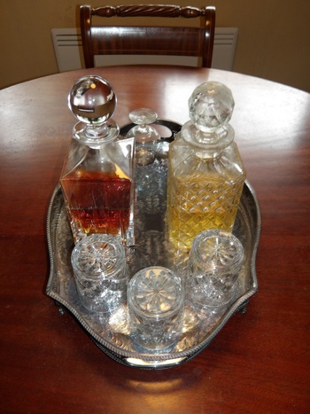 A cold winter has begun in Europe and people are heading indoors, hoping for a warming drink. The silver tray was bought many years ago at an auction, but the decanter to the left was bought at a thrift store and the one to the rigth was bought at a flea market. The rum to the left and the whiskey to the right was added by yours truly.