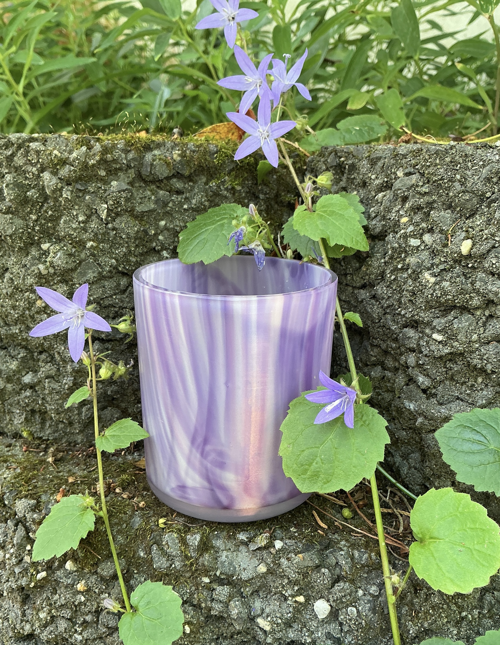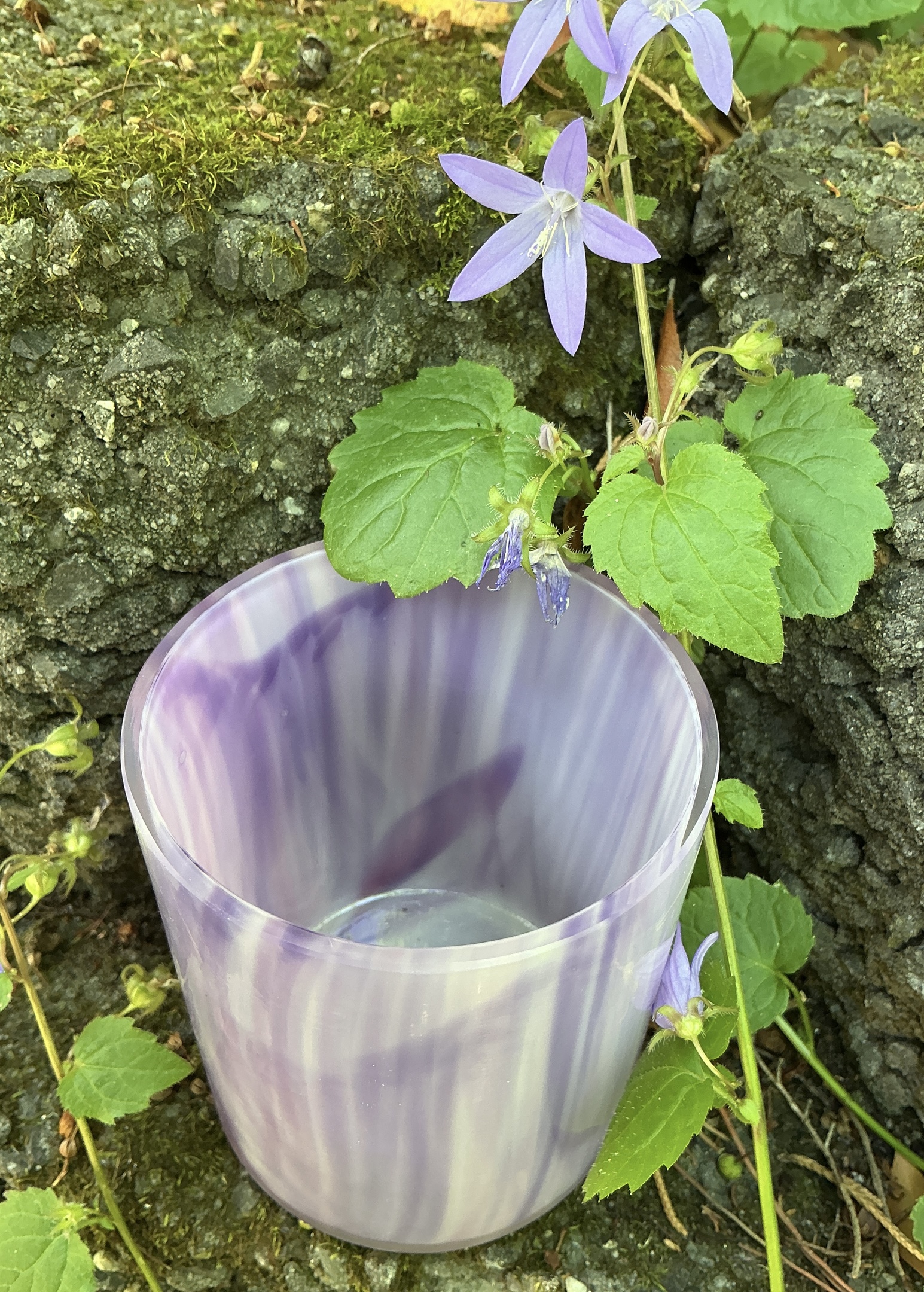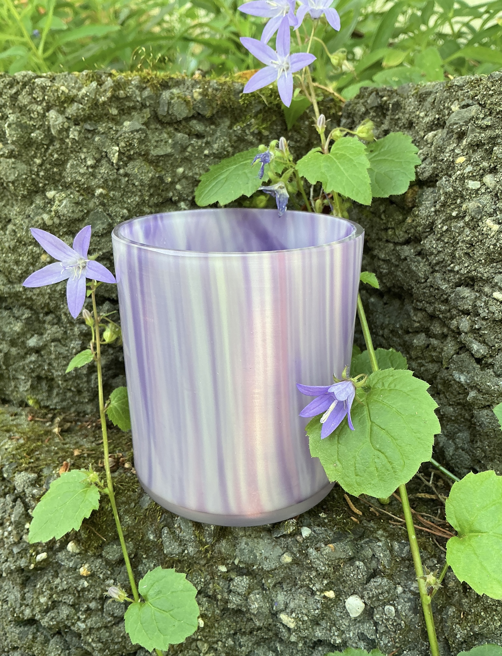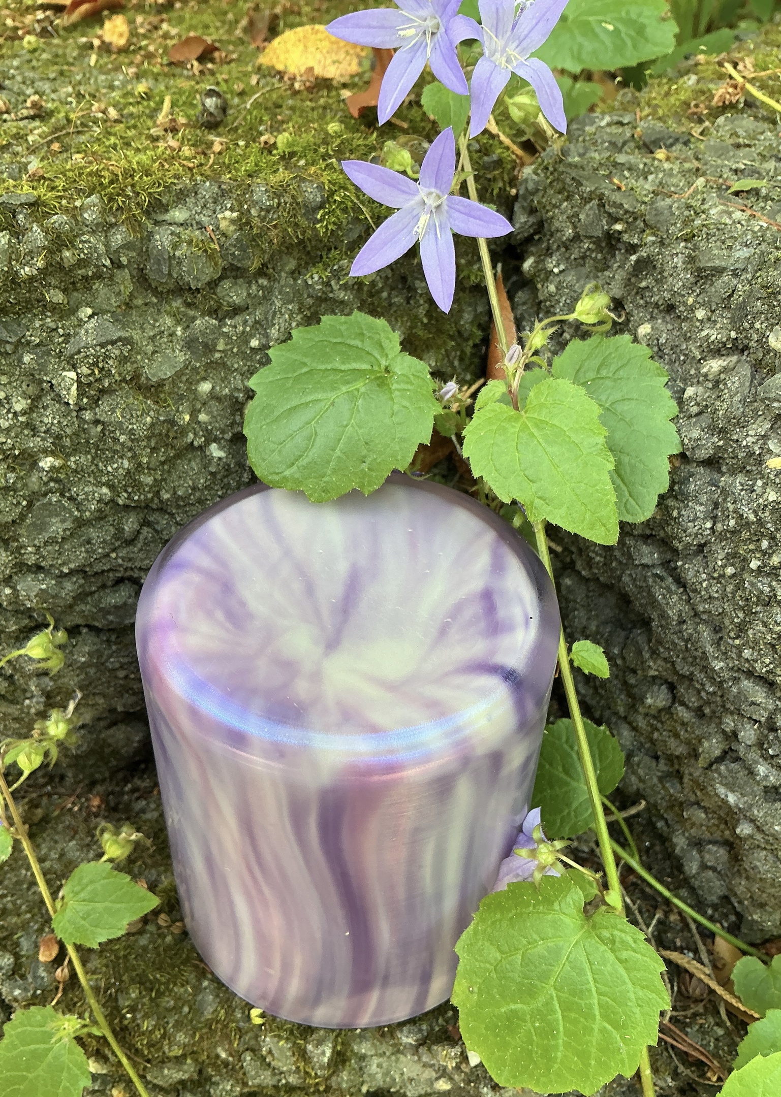 It is made from cased glass, clear over mauve & purple stripes, with a satin iridescent finish. This possibly once had a silver plate lid, as I have a small lidded jar in a pink & yellow stripe with an iridescent finish, most likely by the same maker. But it looks just fine without a lid, so I’m calling it a beaker.