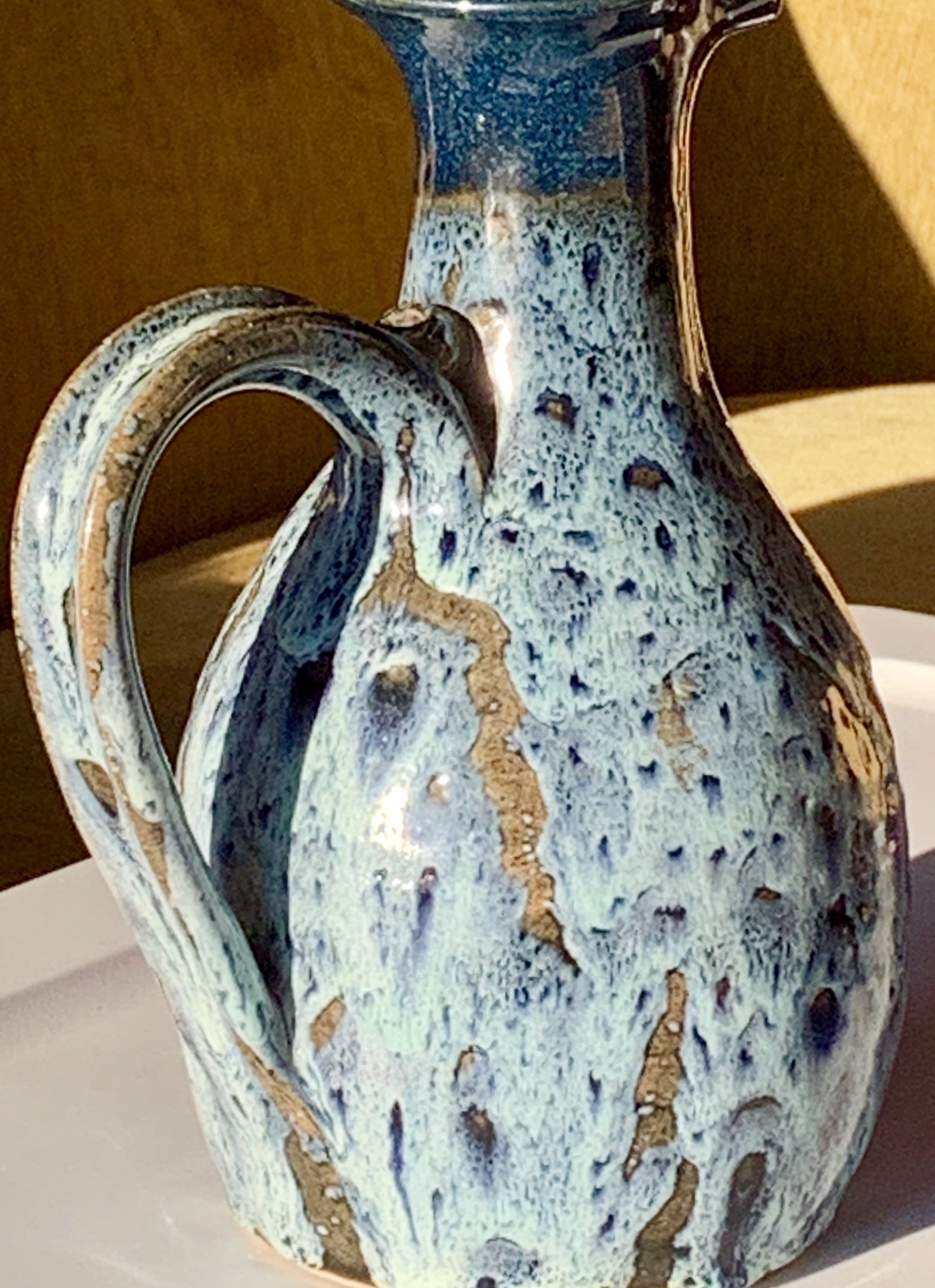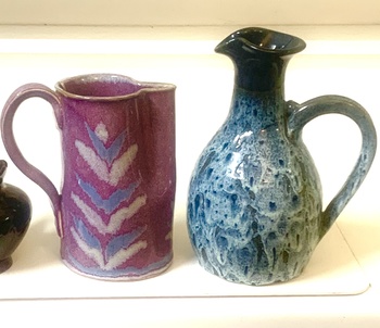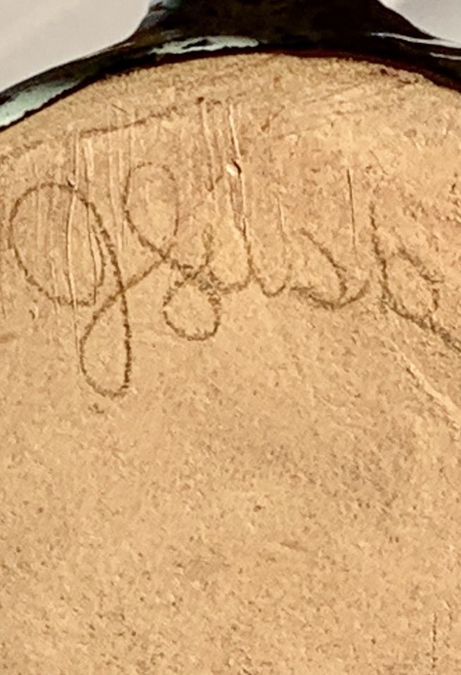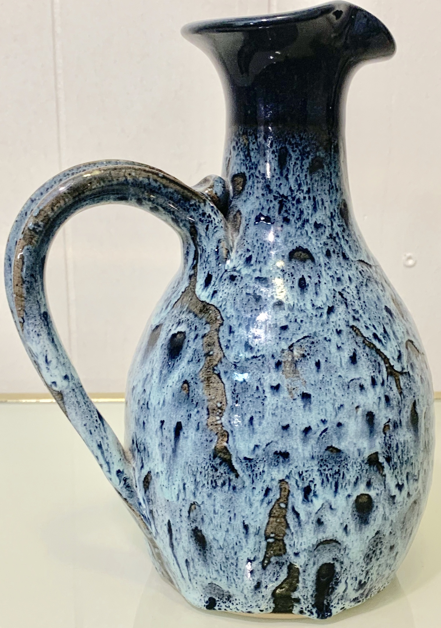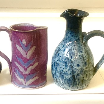 I’m not sure how old the taller pitcher actually is that I’ve had since the 1990’s.The mixture of blue colors in a peacock like pattern is really unique.There’s some green toward the top that reminds me of a mallard duck.Whoever made this did a beautiful job combining these colors in a real thick glaze..Does anyone have any idea who signed this.? With it is a Bay pottery salt glazed pitcher and a 1960’s creamer made by Arrow pottery in Japan.Thanks for looking.