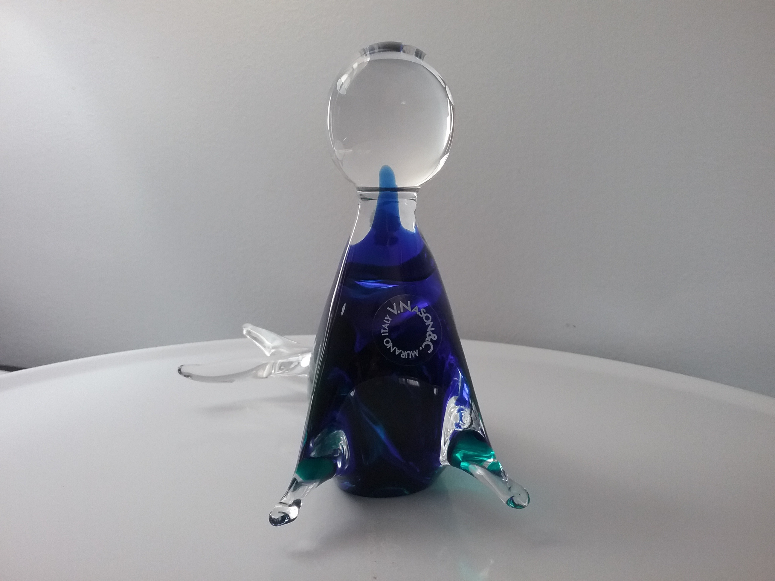 Here is a 5 1-2" performing seal w/ ball in a sommerso blend of cobalt, royal blue & teal with clear glass. By Murano V Nason & Co with orig label ca 1990s